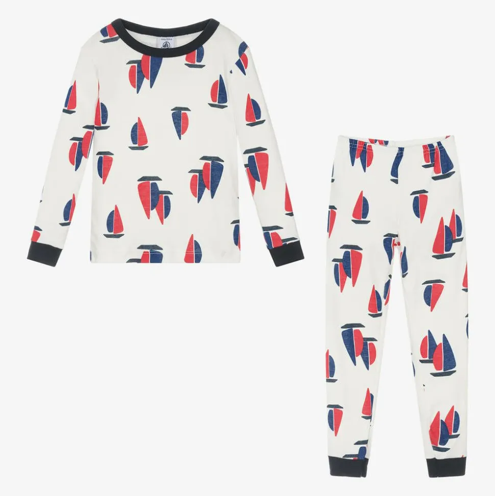 Lovely ivory pyjamas for boys by Petit Bateau, made in soft organic cotton jersey. Patterned with the brand's signature sailboat print, they have ribbed cuffs for comfort and fit snugly.