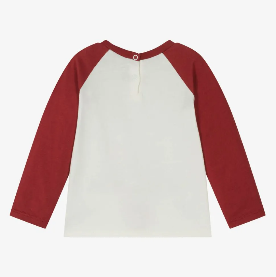 Ivory long-sleeved top for little boys by French brand Bonpoint, made in soft cotton jersey. Casual and comfortable, it has burgundy red raglan sleeves and a lightly ribbed crew neckline. There is a fun race car motif and red logo embroidery on the front, with easy to use popper fastenings on the back.