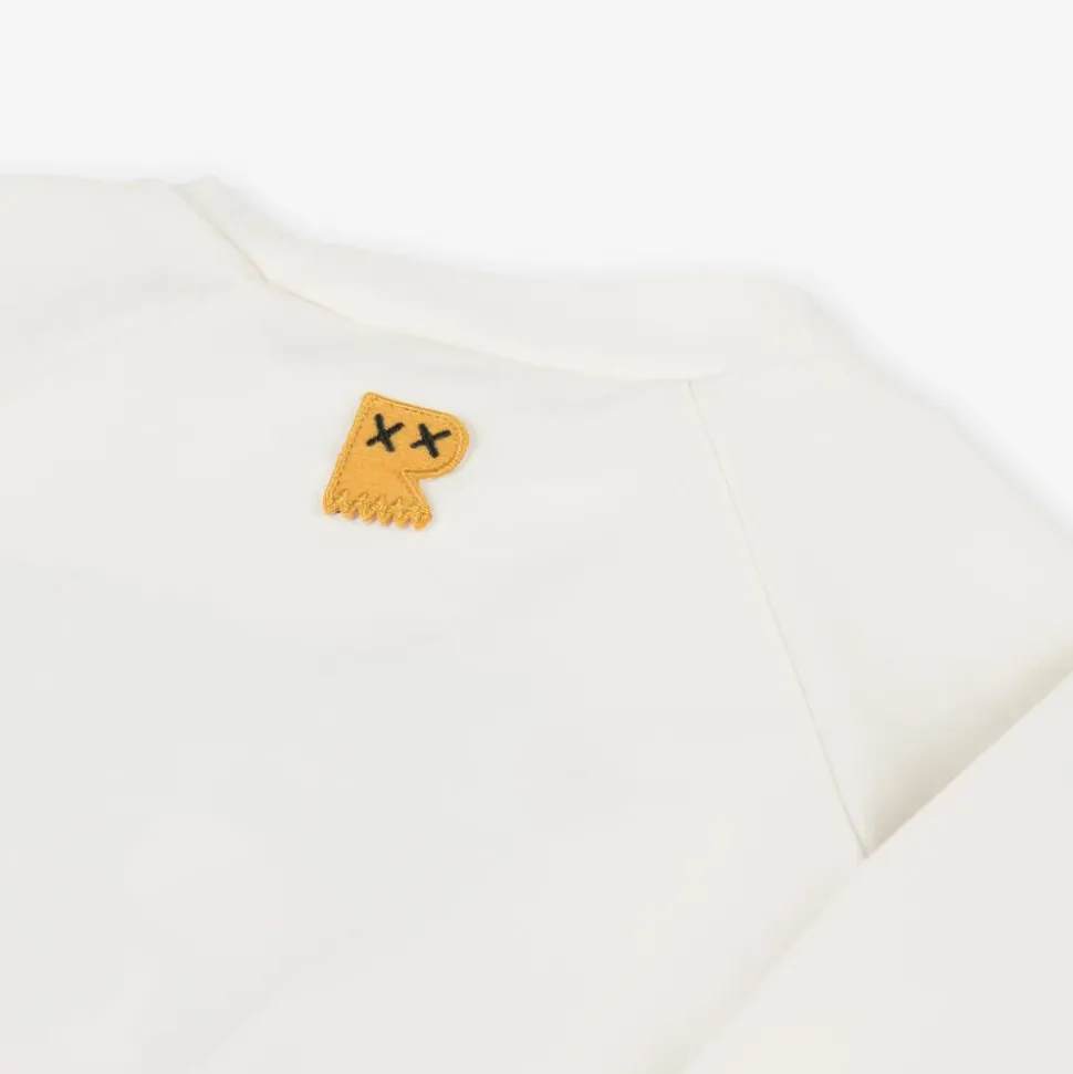 A sun-protective ivory swim top for boys by Australian brand Rock Your Baby. Made in stretchy silky fabric with UPF 50+, it has a high neckline and long sleeves for good coverage in the sun. The front is printed with a large dinosaur in a rubber ring for a fun look. Parts of this garment are made from recycled fabrics.