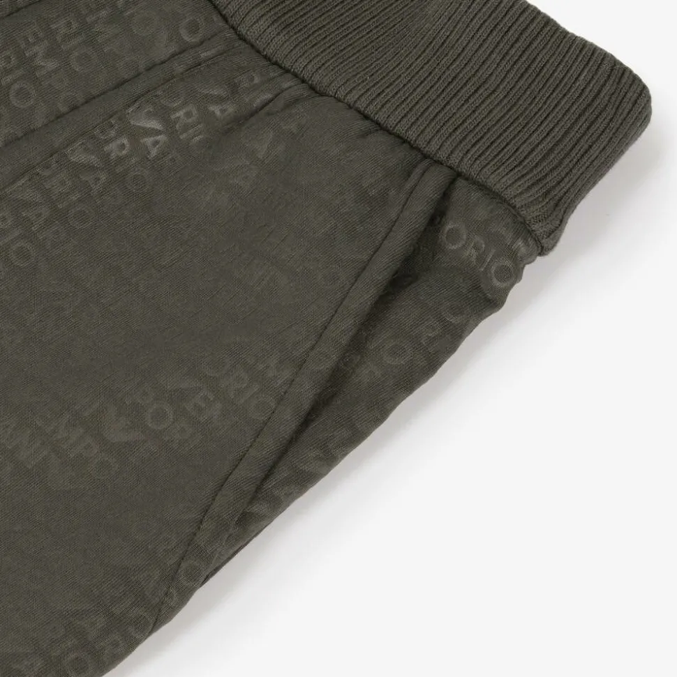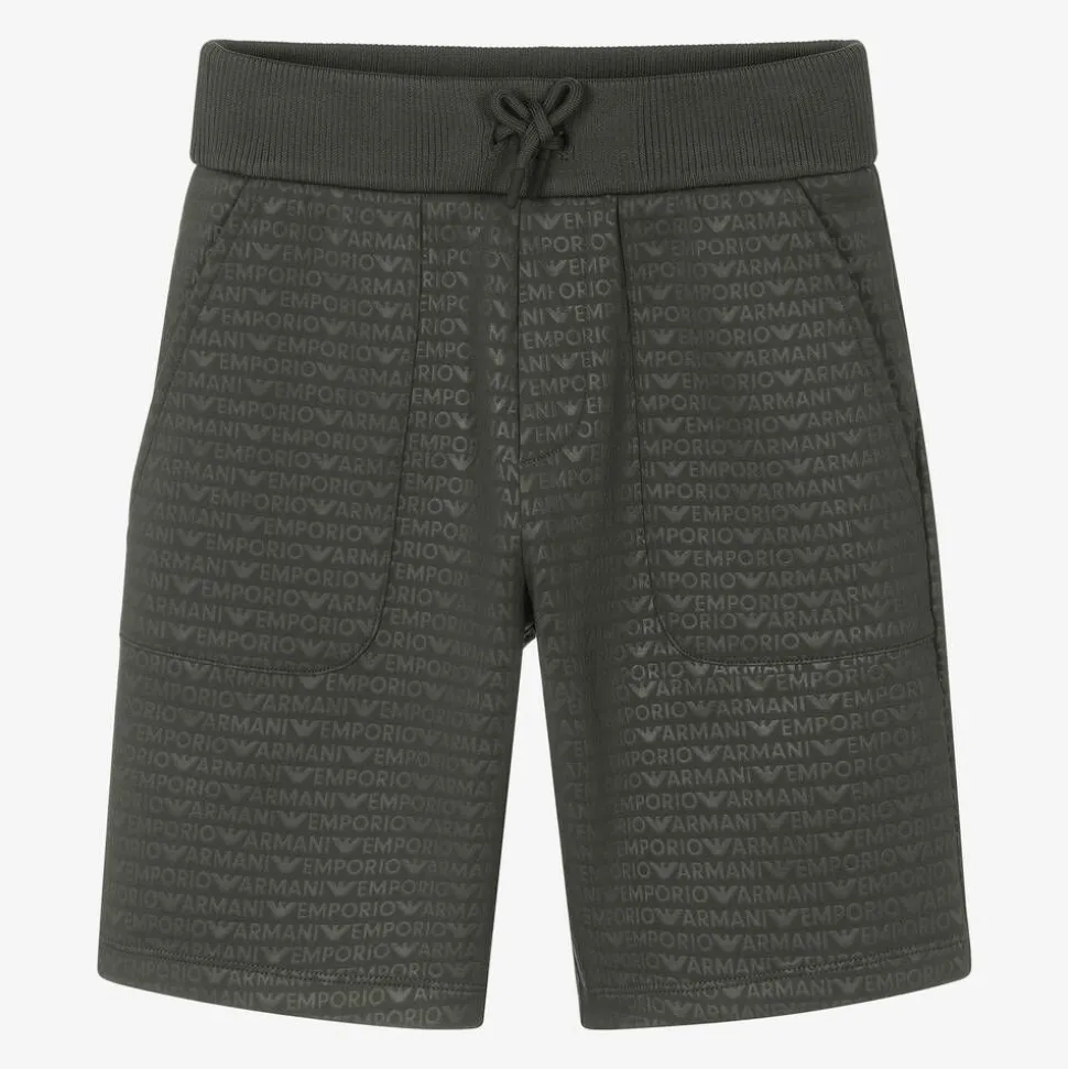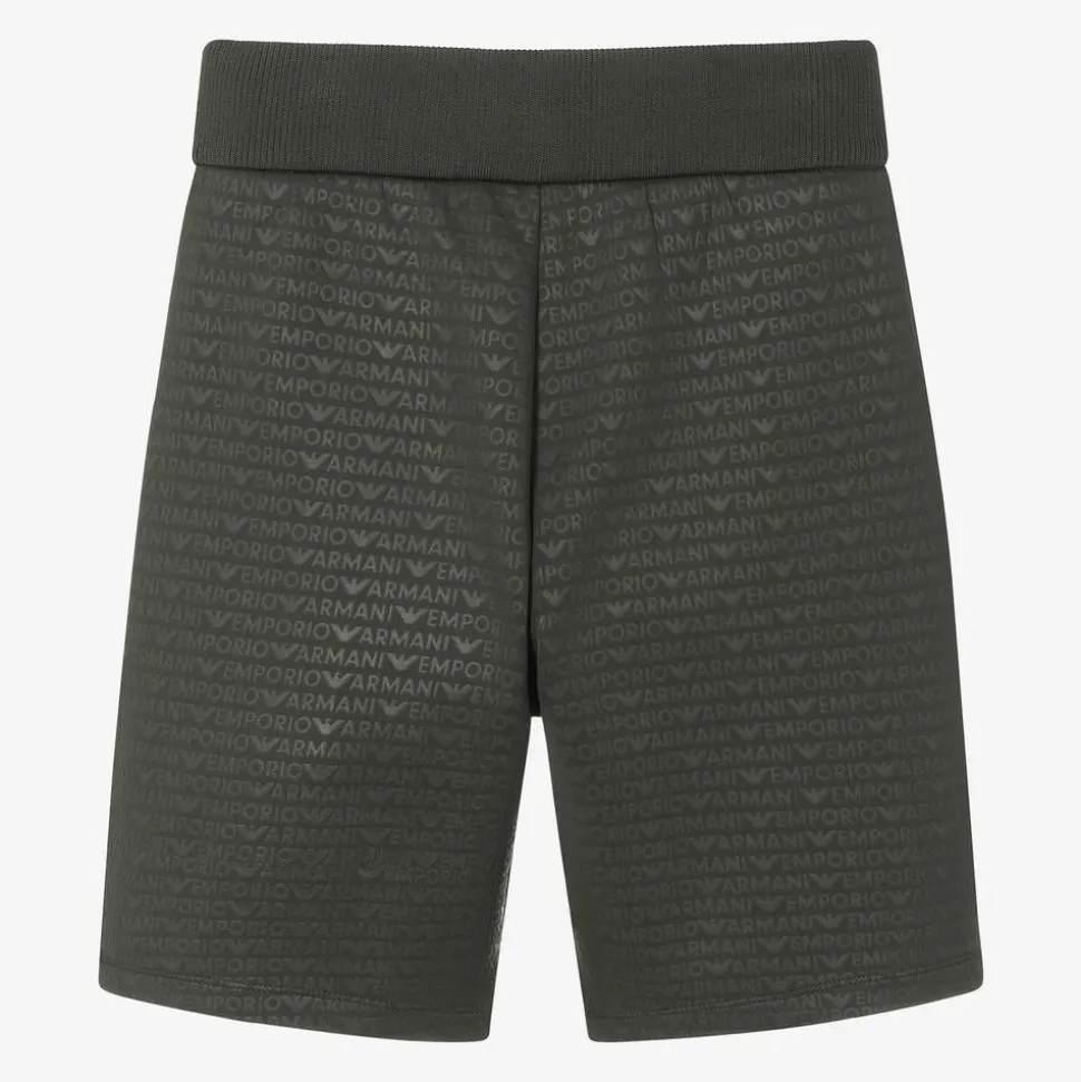 Logo-inspired, khaki green jersey shorts for boys by iconic Italian designer Emporio Armani. Made in a soft cotton blend, these cool shorts have a repeat logo pattern in tonal print with a subtle sheen. There is a comfortable, ribbed waistband with a faux drawstring and useful patch pockets on the front.