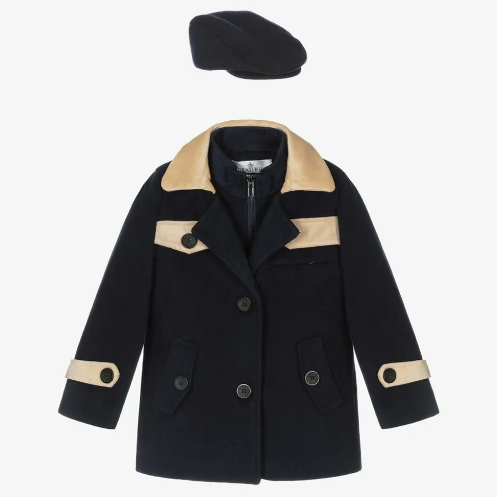A navy blue coat and hat set for boys by Beau KiD, with a beige velvet collar and matching trims. Ideal for colder weather, this mid-weight coat has lightly padded silky lining for extra warmth. It has a zip-up panel with a high neck beneath the front button fastenings, for a cool layered look. There are slanted pockets at the waist and faux pocket detailing on the front. A coordinating flat cap completes the outfit.