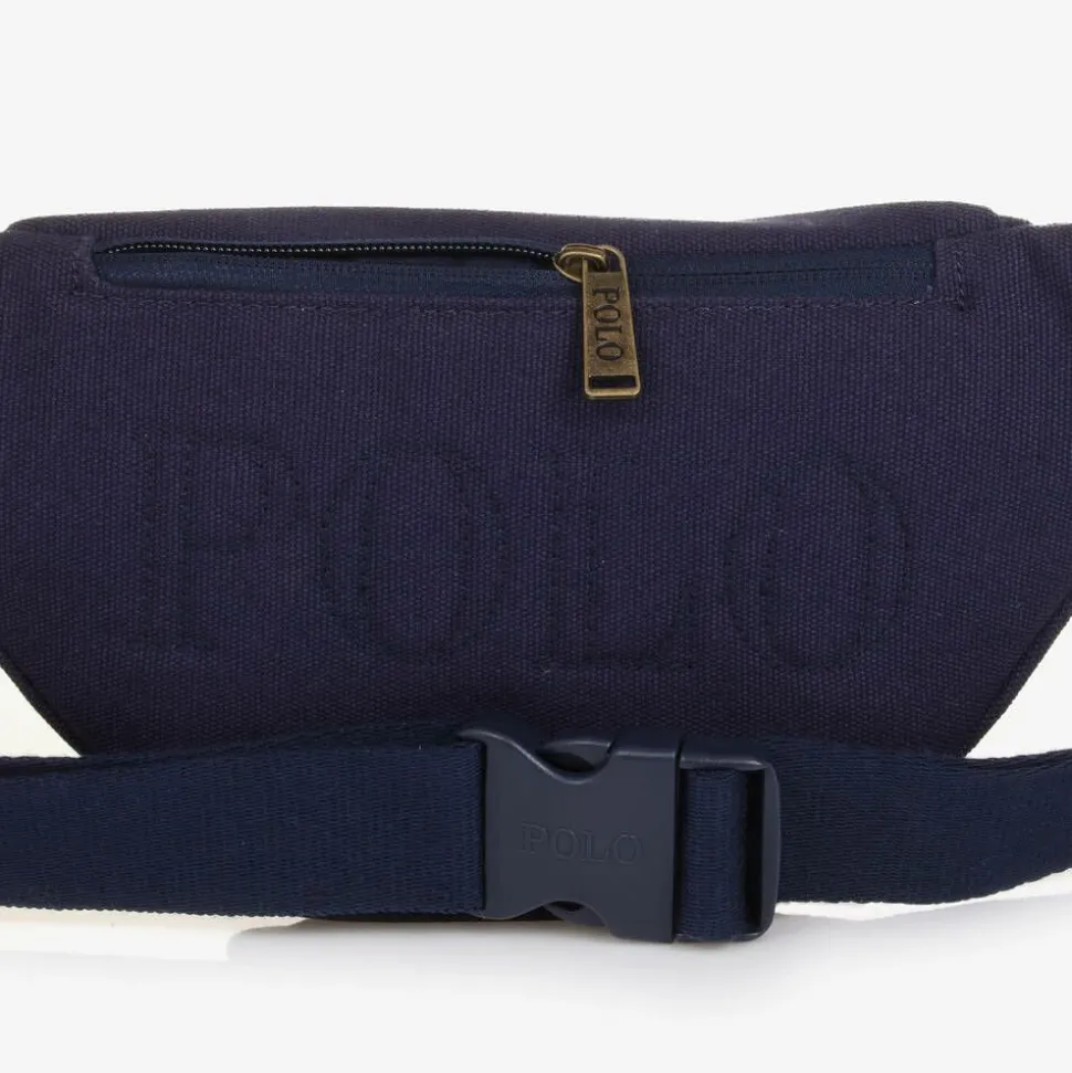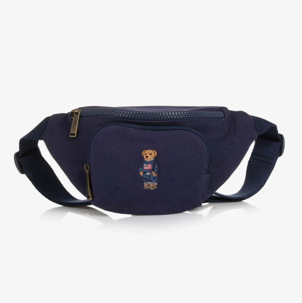 From Ralph Lauren, a navy blue cotton belt bag for boys with an embroidered Polo Bear on the front. With two zip fastening compartments for convenience, this useful bag has adjustable straps for a secure and comfortable fit.