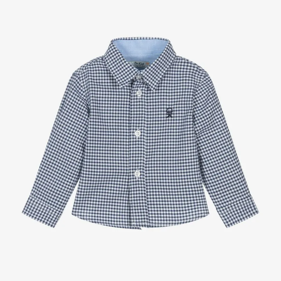 Navy blue and white check shirt for younger boys by Dr. Kid, made in soft cotton. Lovely for both smart and casual occasions, this long-sleeved shirt has pale blue Oxford cotton trims on the inside of the pointed collar and cuffs. It fastens neatly with pearlescent buttons and for designer appeal, has the brand's logo embroidered on the chest.