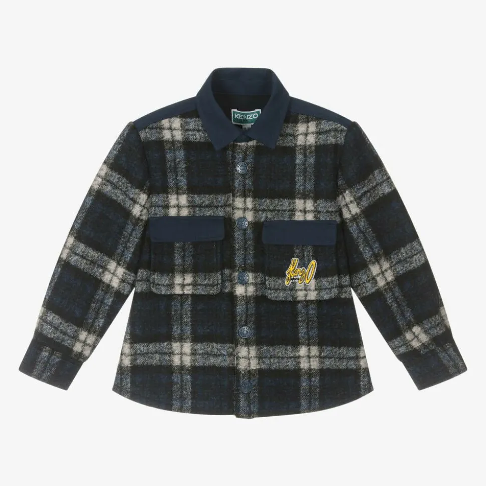 A navy blue and grey shacket for boys by KENZO KIDS, fastening with branded poppers. Woven with wool for cosy warmth, the outer has a soft brushed finish, while the interior has a soft jersey feel for comfort against the skin. This cool top has flap pockets on the chest with a yellow logo patch for a distinctive look. The navy blue twill collar and matching trims complete this casual style.
