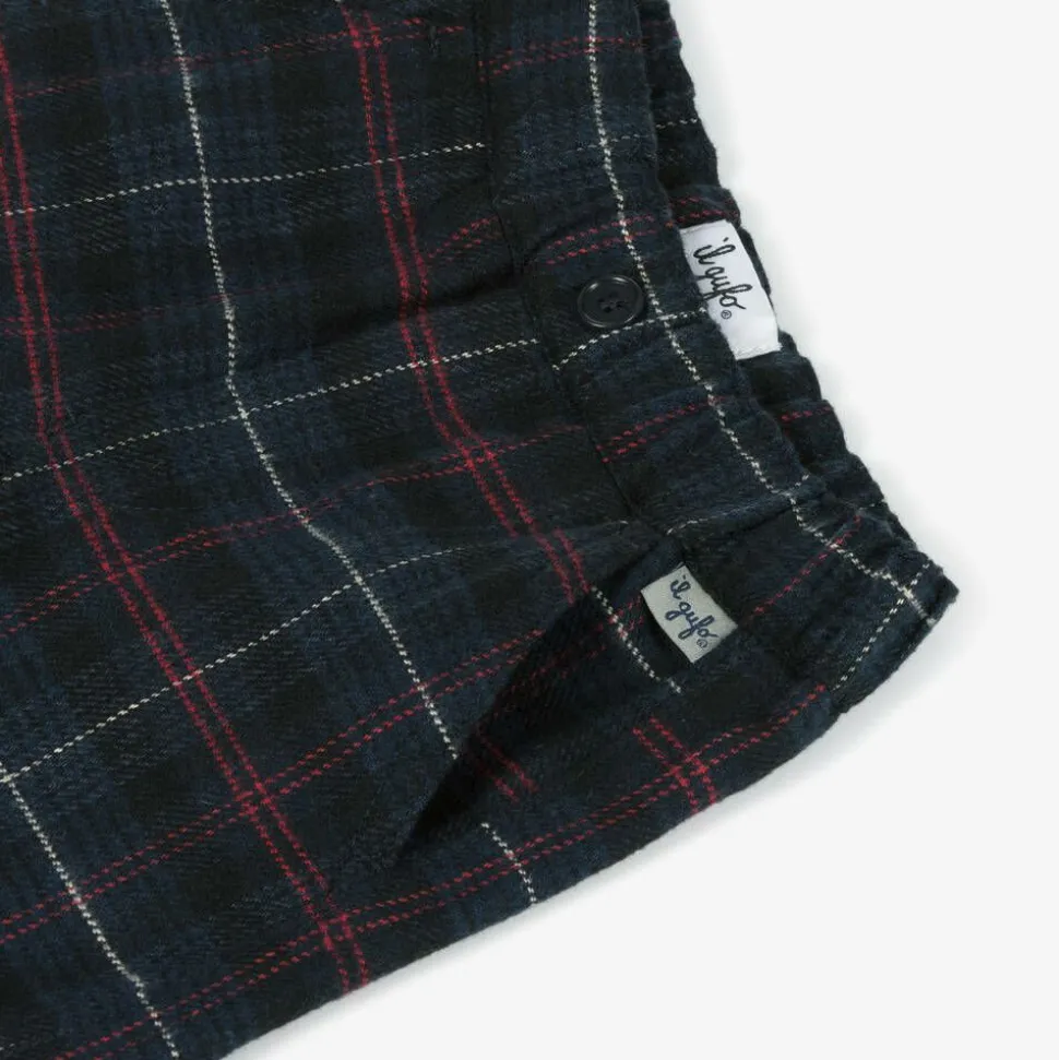 Navy blue trousers for younger boys by luxury Italian brand, Il Gufo. Woven in a soft brushed viscose and cotton blend with a touch of wool for extra warmth, they have a charming blue, black and red check pattern. This pull-on style is elasticated around the waist and cuffs with two slanted front pockets.