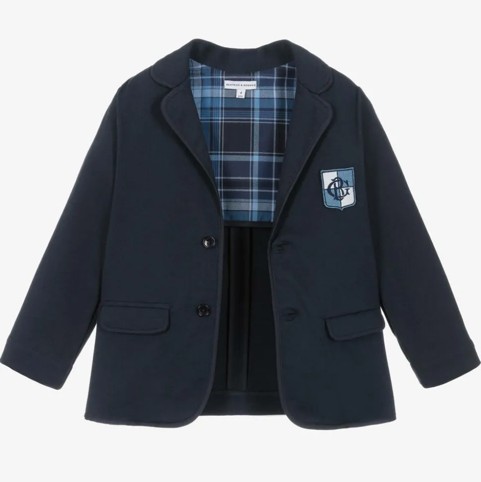 Exclusive to Childrensalon, a navy blue blazer for boys by British heritage brand Beatrice & George. Both smart and comfortable, it is made in soft, cotton-blend jersey with a little stretch for comfort. The jacket has notched lapels and a stylish monogram logo patch on the chest, as well as useful front pockets. Fastening with buttons, there are matching, decorative buttons on the cuffs and a partial, blue tartan cotton lining.