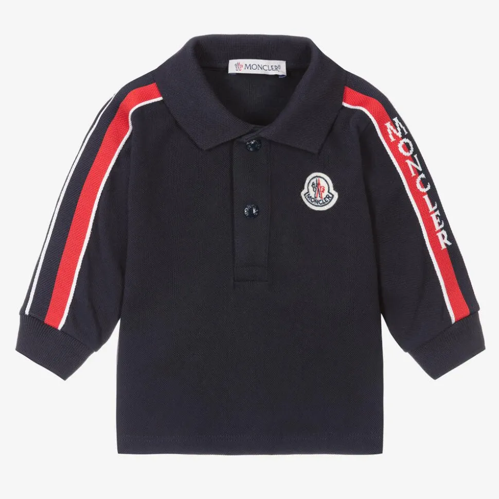 Navy blue polo top for little boys by luxury brand Moncler Enfant, made in soft and stretchy cotton piqué. In a sporty style, this long-sleeved top has striped trims on the sleeves highlighted with the designer's name. The iconic felt logo patch can also be seen on the chest. There are branded popper fastenings on the front and lightly ribbed trims.