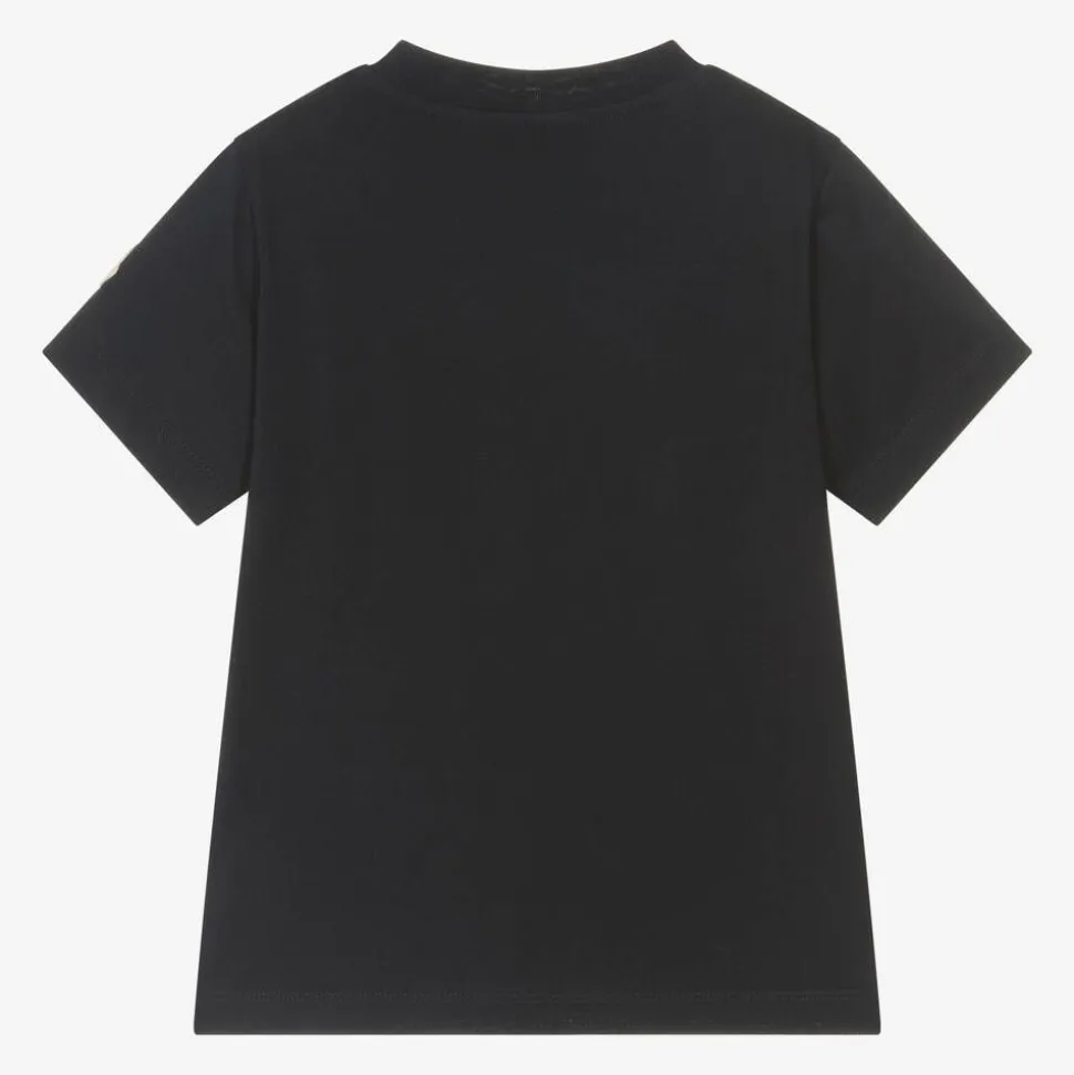 Navy blue T-shirt for boys by luxury brand Moncler Enfant. For designer appeal, it has an orange logo printed across the front, with the iconic felt logo patch on one sleeve. Made in soft cotton jersey, this casual tee has short sleeves and a ribbed crew neckline.