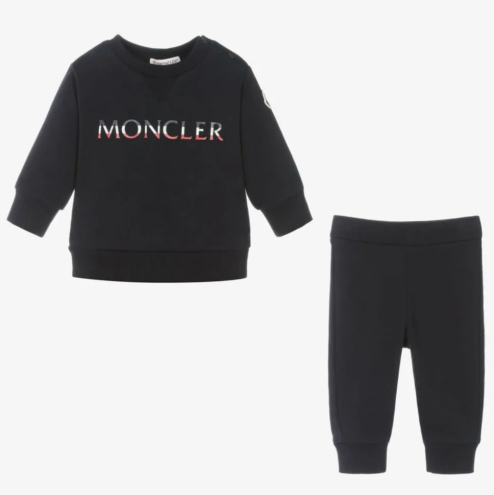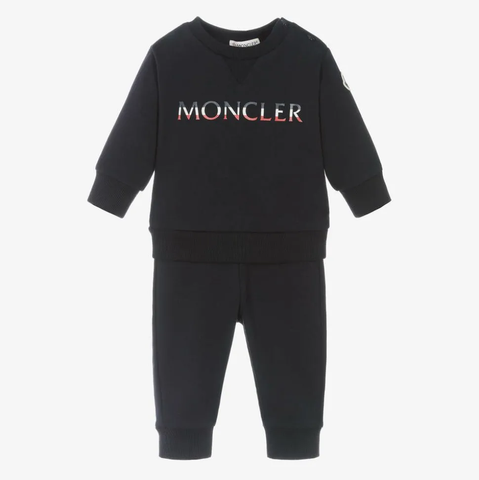 Casual navy blue cotton tracksuit for little boys by luxury brand Moncler Enfant. It is made in soft jersey with a cosy fleecy inside and ribbed trims. The sweatshirt features a tricolour logo print across the front and the designer's iconic patch on one sleeve for a signature look. It fastens with easy poppers on one shoulder. The joggers have a comfortable elasticated waist, trimmed with a small logo tab on the back.