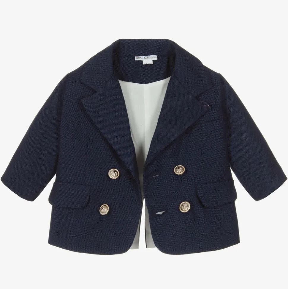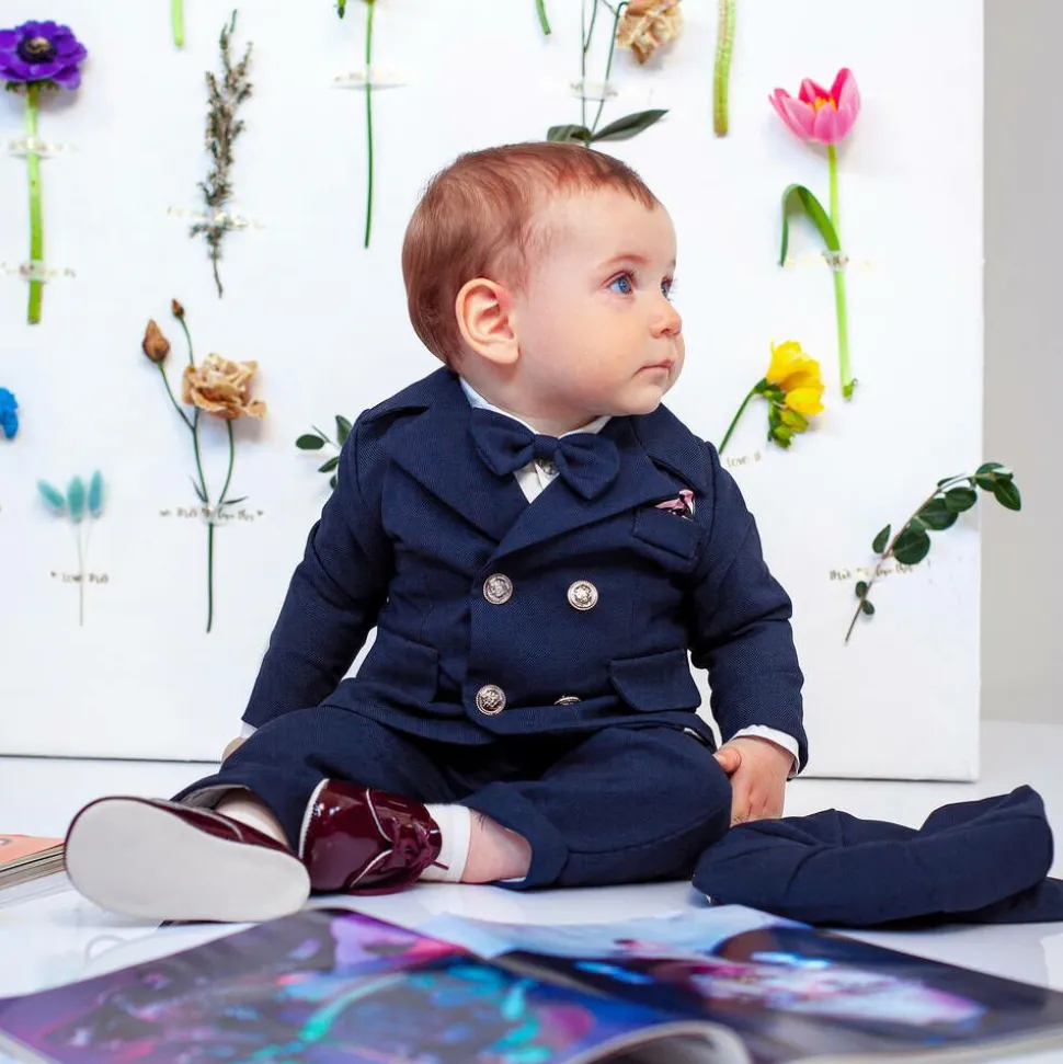 Super smart navy blue suit for little boys by Andreeatex, made in a waffle weave fabric with a lightweight cotton lining. The double-breasted blazer has gold crest buttons and faux pocket detailing. It pairs with a lightweight, white button-up cotton shirt, easy pull-on trousers and a matching bowtie. To complete the look, smaller sizes come with a flat cap.