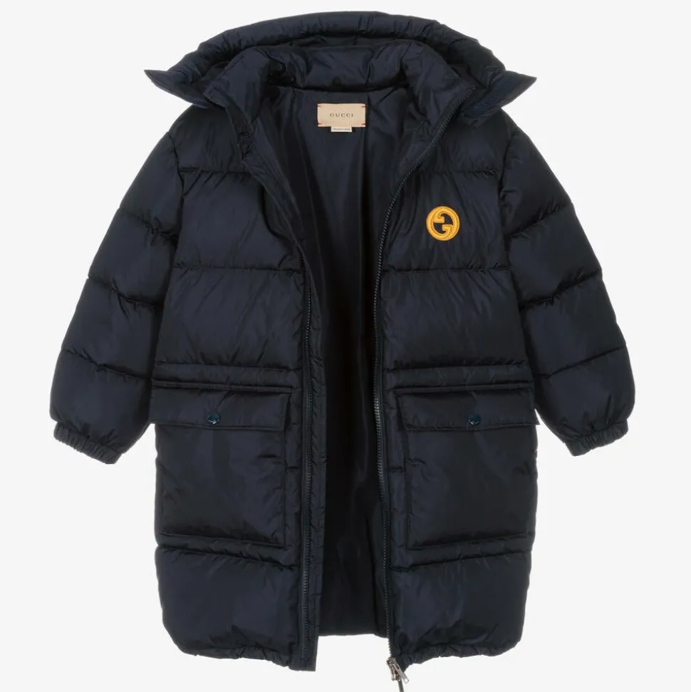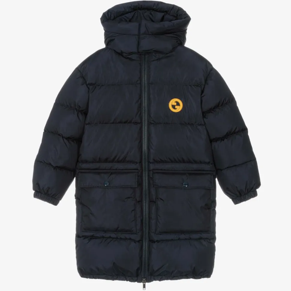 Navy blue puffer coat for boys from Italian designer Gucci, padded with cosy, luxurious down. Soft and silky, this signature piece is designed with golden yellow Interlocking G embroidery on the chest and a striking drip-effect logo appliqué on the back in complementary red, orange and yellow hues. Helping to protect him from the elements are the elasticated cuffs and hem, a large hood that fastens with velcro on the front, and cotton-lined pockets with popper closures. Lined with silky fabric, it fastens with a branded silver-tone two-way front zip to help make dressing simple.