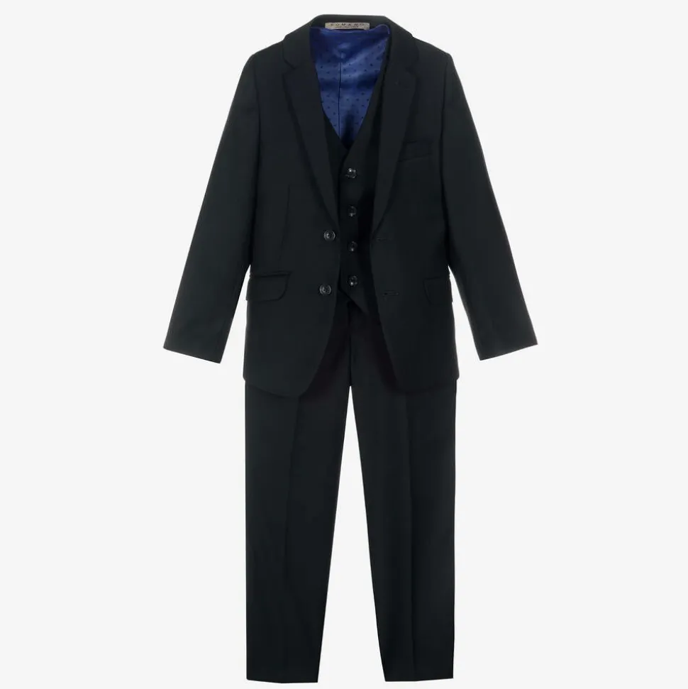 Boys dark navy blue suit from Romano's luxury collection. Beautifully made from a soft viscose mix, the single-breasted jacket is fully lined in silky satin and the trousers have an adjustable elasticated waist for comfort. To complete the suit, it comes with a matching waistcoat.