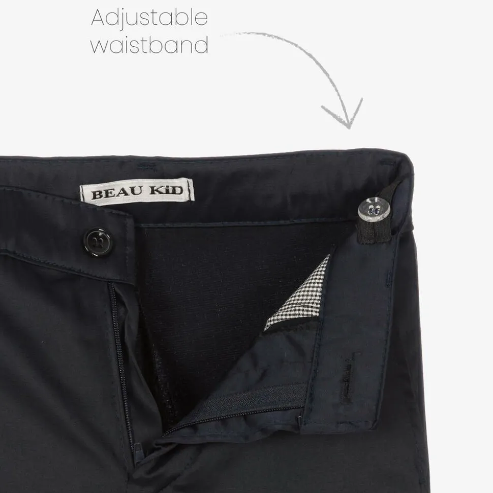 Smart navy blue tuxedo suit for boys by Beau KiD, comprising a suit, bow tie, pocket square and shirt. The navy blue honeycomb satin blazer has silky lapels and a black gemstone button fastenings. The white dress shirt has a winged collar for a classic look. The navy blue satin trousers have an adjustable waist, ensuring a good fit. The set is completed by a matching, adjustable bow tie.