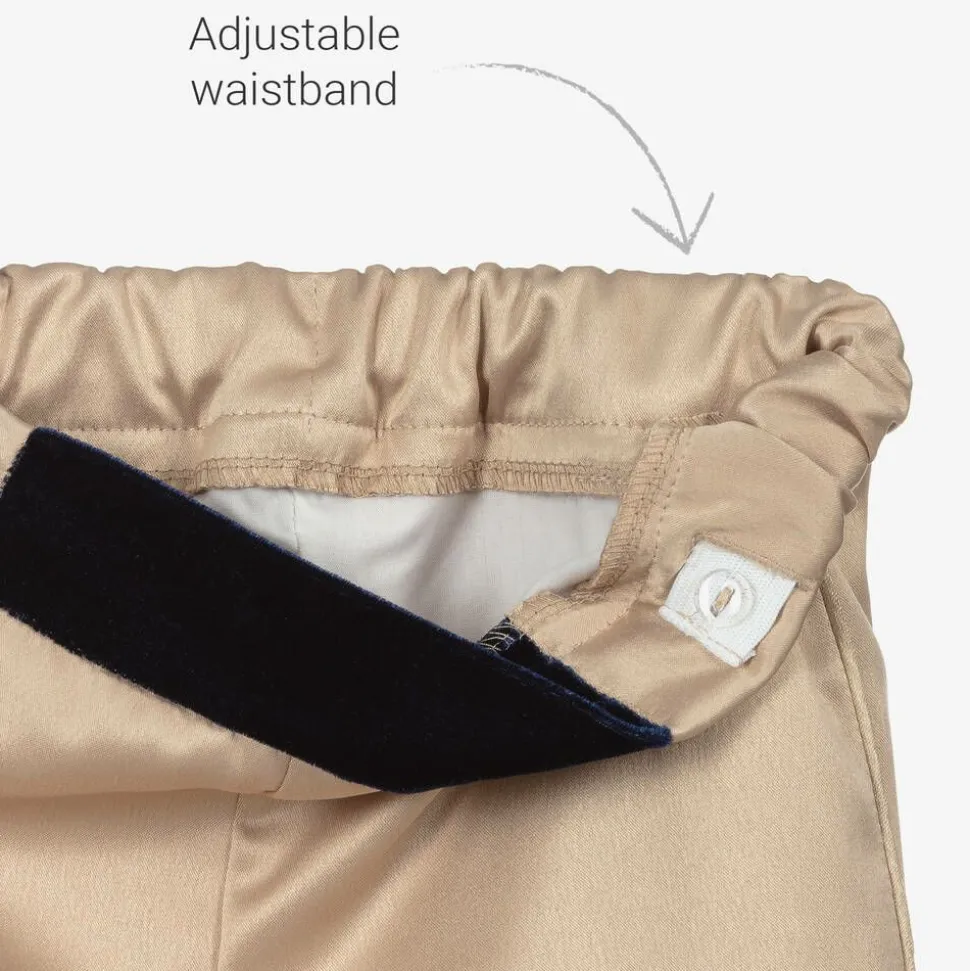 Ideal for special occasions, this navy blue velvet and satin suit for little boys is by Andreeatex. Lined for comfort, the long-line jacket has a luxurious feel with ornate, gold embroidered trim and shiny gold buttons on the stand-up collar. The white, puffed-sleeve, collarless shirt has a traditional lace ruffle, which sits underneath the neckline with a large sapphire blue gem and attaches with buttons. The gold satin trousers have a part-elasticated waist for comfort and tie the look together beautifully with the blue velvet trim on the front. This exquisite set comes with a matching blue velvet hat with statement feather detail.