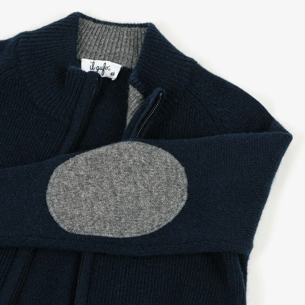 Stylish navy blue cardigan for boys by luxury Italian brand Il Gufo. Knitted in super soft virgin wool, this warm layering piece has a high neckline, contrast grey elbow patches and ribbed trims. The front zip fastening has a logo-engraved pull for a subtly branded finish.