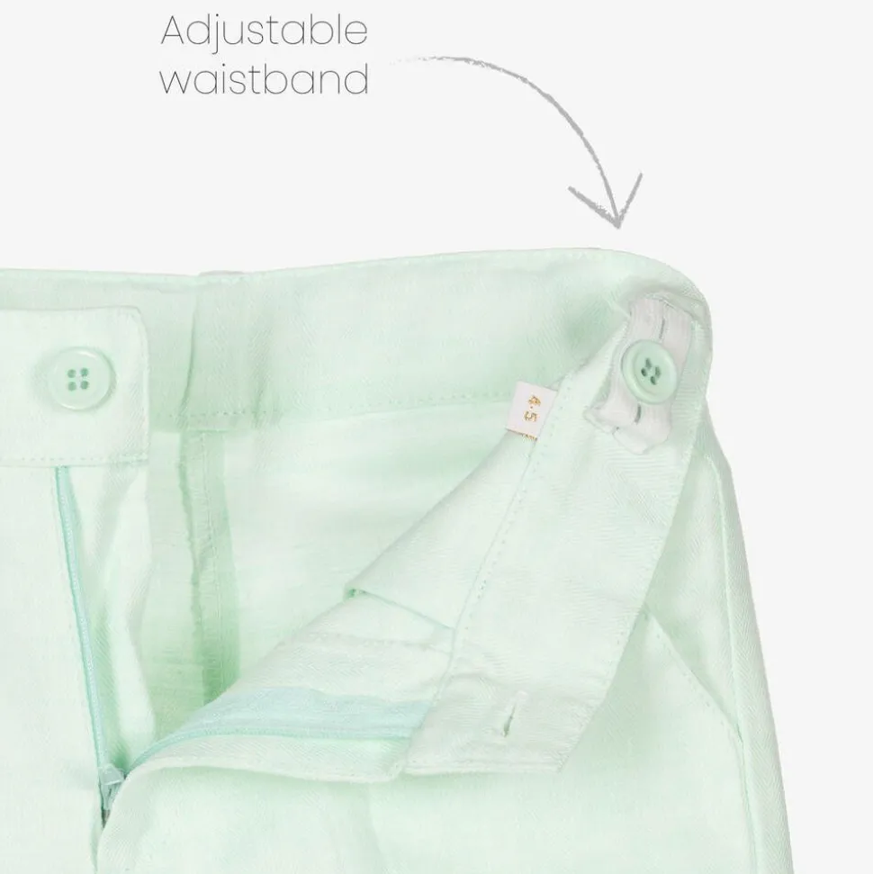 Charming three-piece pale green shorts suit for boys by Caramelo Kids, made in a linen and cotton blend in a subtle herringbone weave. This warm-weather smart set includes a tailored blazer, coordinating shorts and a matching waistcoat. The jacket fastens with buttons and is lined in silky satin. The shorts have a button and zip to fasten, with belt loops and an adjustable waistband. The waistcoat has a white silky satin backing with an adjustable buckle strap and buttons on the front to fasten.