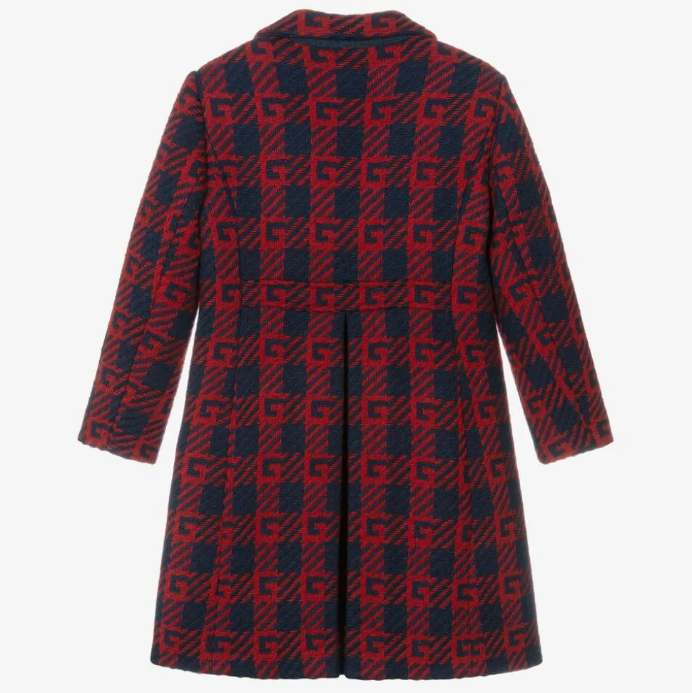 Vintage-inspired red and navy blue coat for boys from Italian luxury designer, Gucci. Elegant and traditional in style, it is made from woven wool with the brand's archival Square G design in a check pattern. Double-breasted, it has a stylish revere collar, front welt pockets and an inverted pleat on the back. The coat is beautifully finished with a pale blue satin lining.