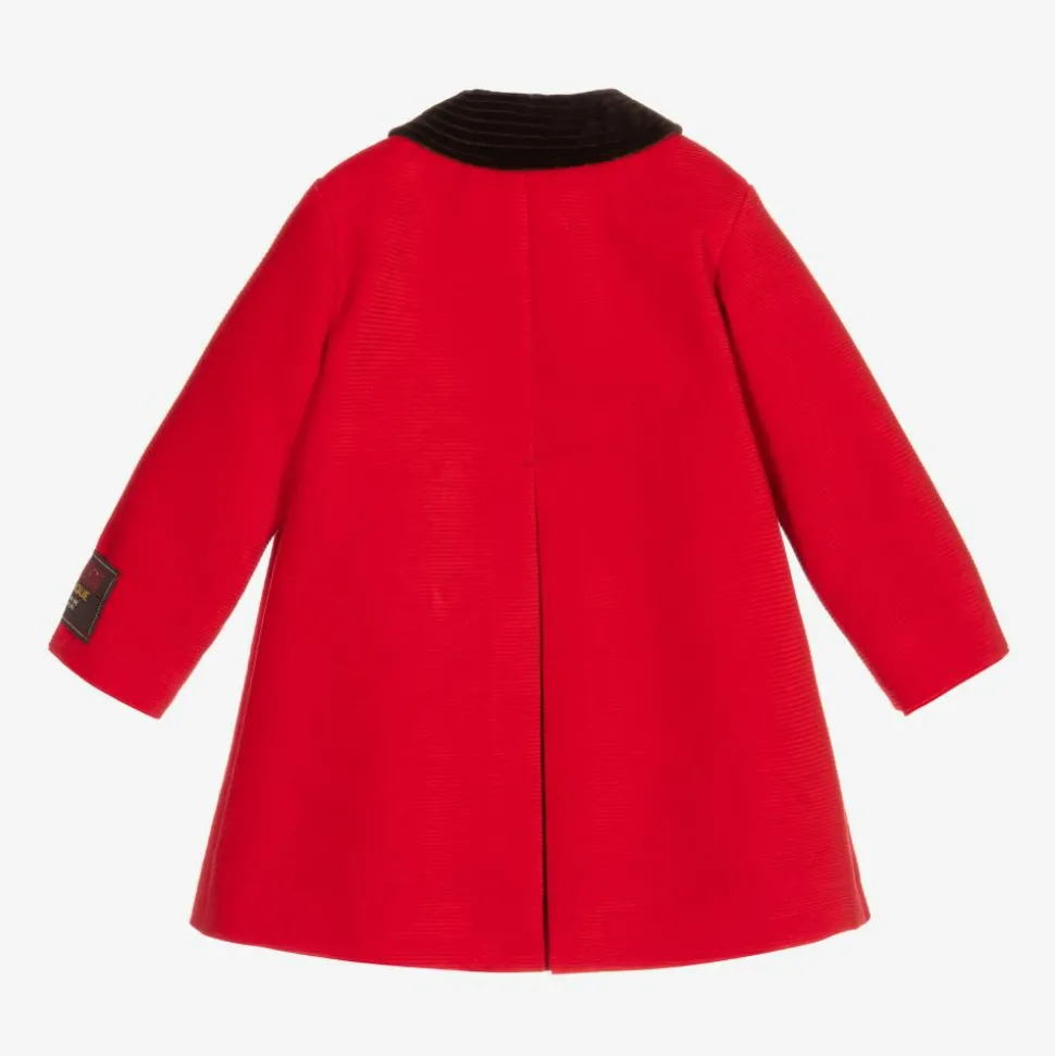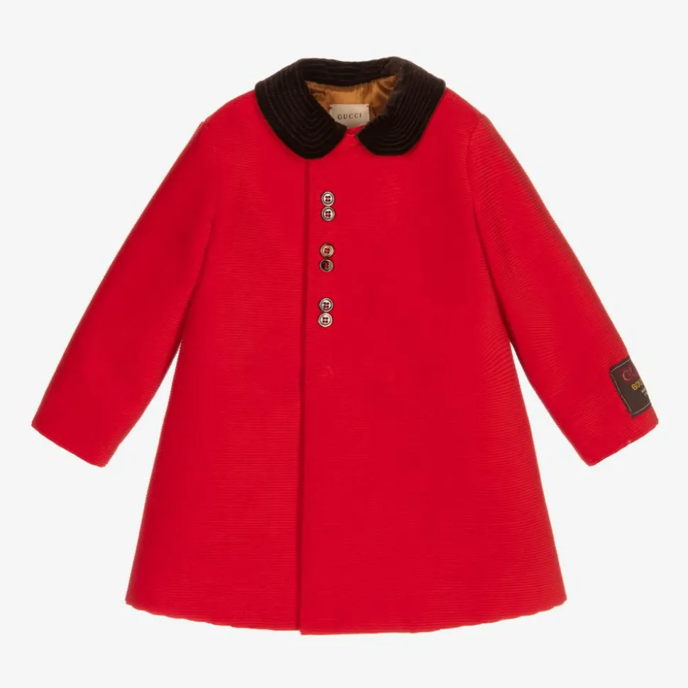 Little boys red corduroy coat by luxury Italian designer Gucci. Lined in silky quilted viscose, this smart, vintage-style cotton coat has a Gucci Boutique label on one sleeve and a soft brown velvet Peter Pan collar. There are decorative tortoise shell buttons above the front popper fastenings.