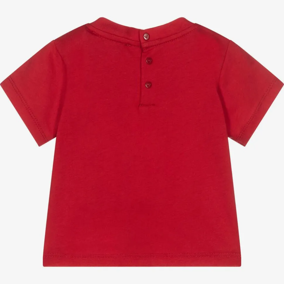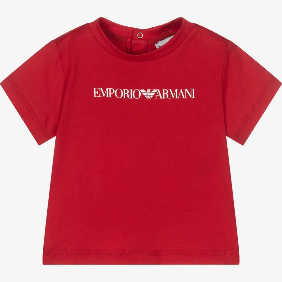 Little boys red short-sleeved T-shirt from Emporio Armani, made in super soft and stretchy cotton jersey. It has Emporio Armani printed in white on the front for a logo-inspired look and branded popper fastenings on the back.