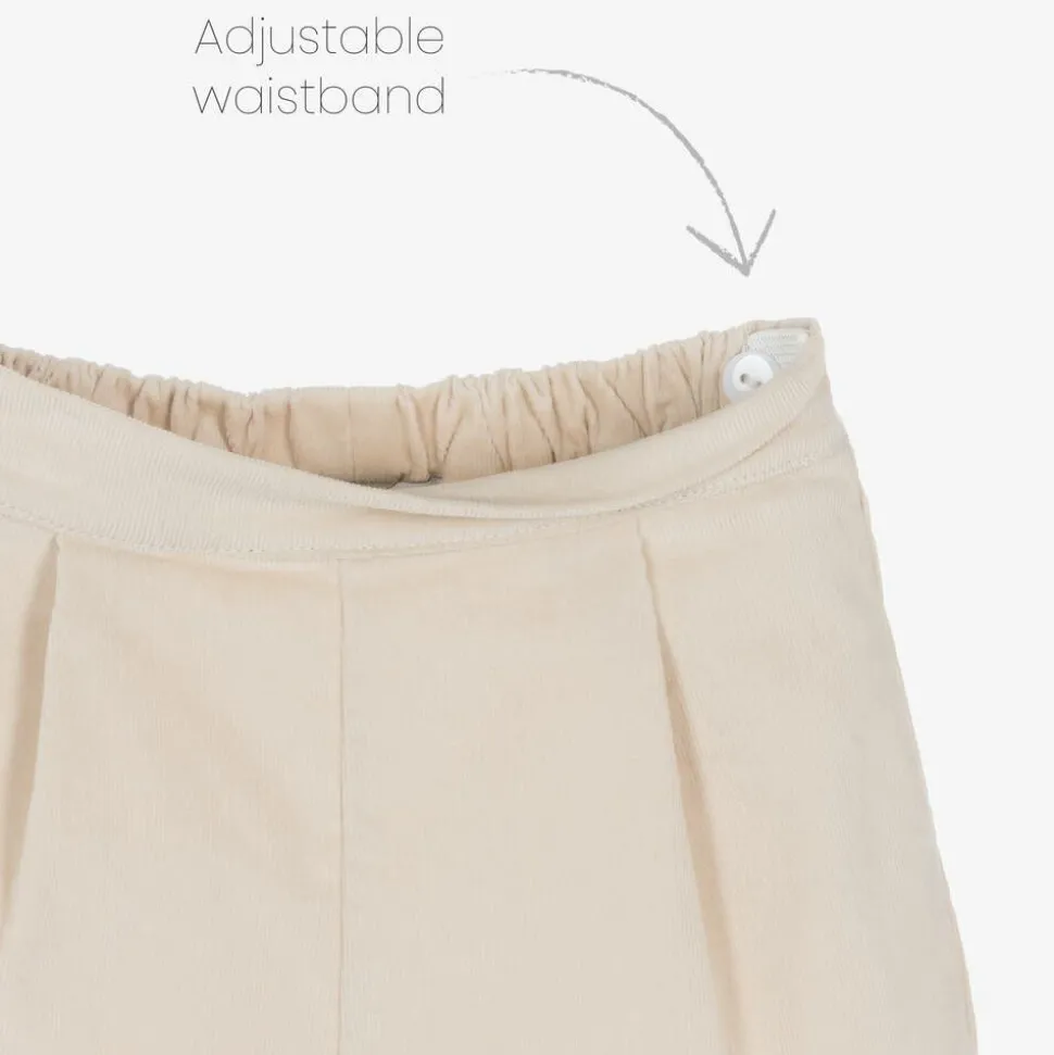 Cute red cotton shorts set for little boys by Spanish brand Babidu, in a smart and traditional styling. The red and white gingham, collarless seersucker shirt has long sleeves and a faux pocket on the chest. It fastens with wood-effect buttons on the front and cuffs. The beige needlecord shorts have an elasticated and adjustable waistband, with semi-elasticated cuffs and are easy to wear, simply pulling up.