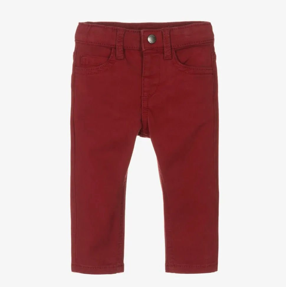 Dark red trousers for little boys by Mayoral, made in soft cotton twill with added stretch. Designed to look like jeans, these casual, slim fit trousers have five-pocket styling and a logo patch stitched on the back of the waistband. They fasten with a branded popper and they have an adjustable waist for extra growing room.
