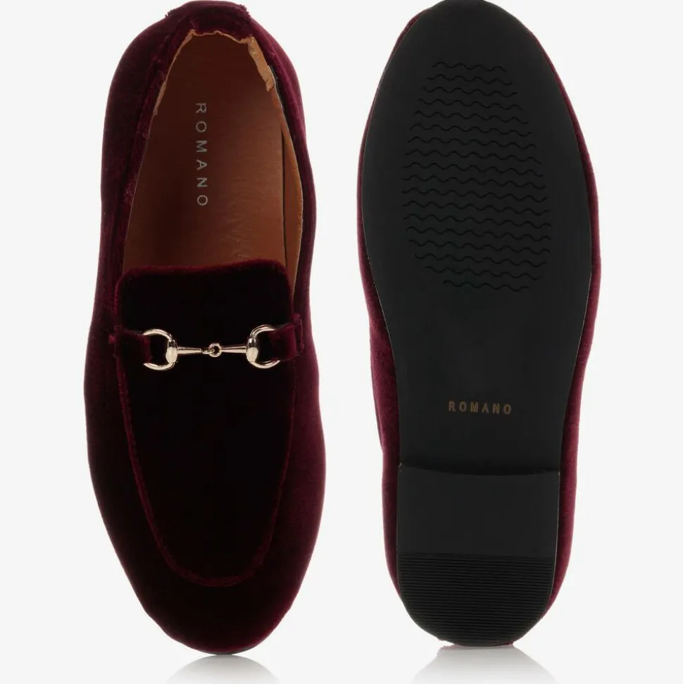 Smart and elegant, these red loafers for boys by Romano are made from soft velvet. Lined in smooth faux leather with a slim non-slip rubber outsole, these slip-on shoes have a gold horsebit detail across the toes, for a classic look.