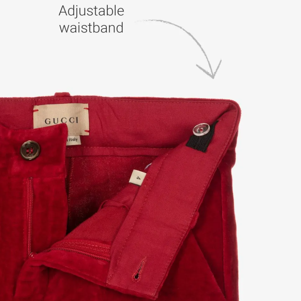 Boys crushed red velvet trousers by luxury brand, Gucci. Forming part of the Ouverture collection, these smart chinos take influence from the 60's and 70's, with a nod to the House's archive designs. They have side pockets and a shiny button and zip fastening on the front. They have a logo tag stitched on the back and an adjustable waist.