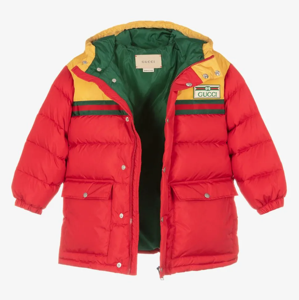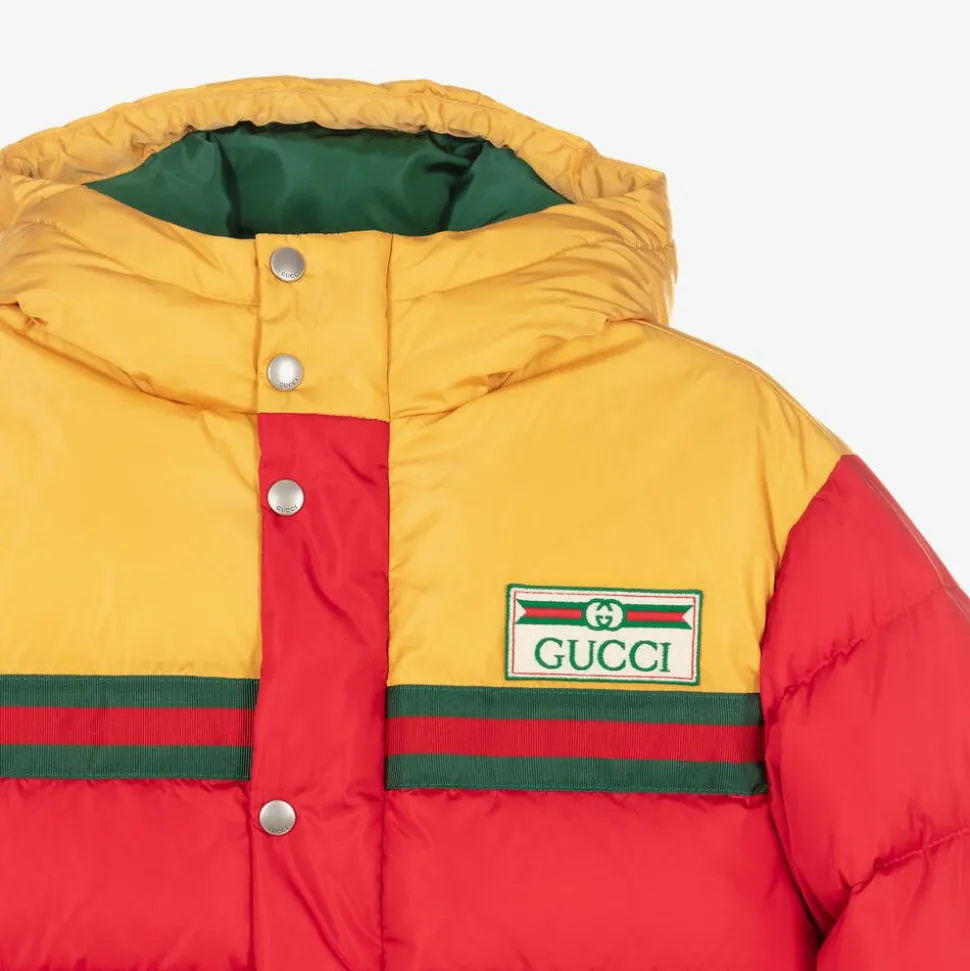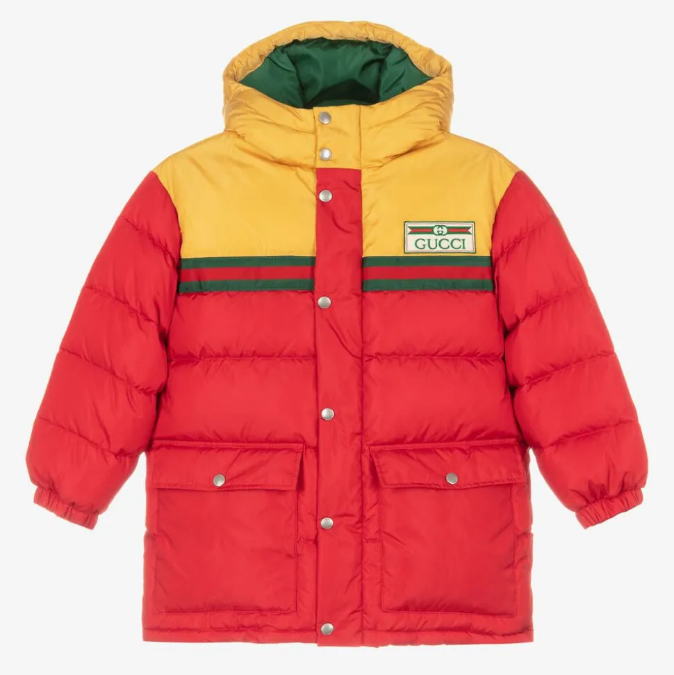 In red and yellow, this stylish puffer coat for boys is by luxury Italian brand Gucci. It has an Interlocking G logo patch on the chest, with the signature Web trim for an unmistakable designer look. The coat is silky smooth and padded in soft down for superior comfort and warmth. To help keep out chilly winds, it has elasticated cuffs and a popper fastening storm flap over the front zip. There are useful popper fastening front pockets, and the fixed hood provides extra protection against the elements.