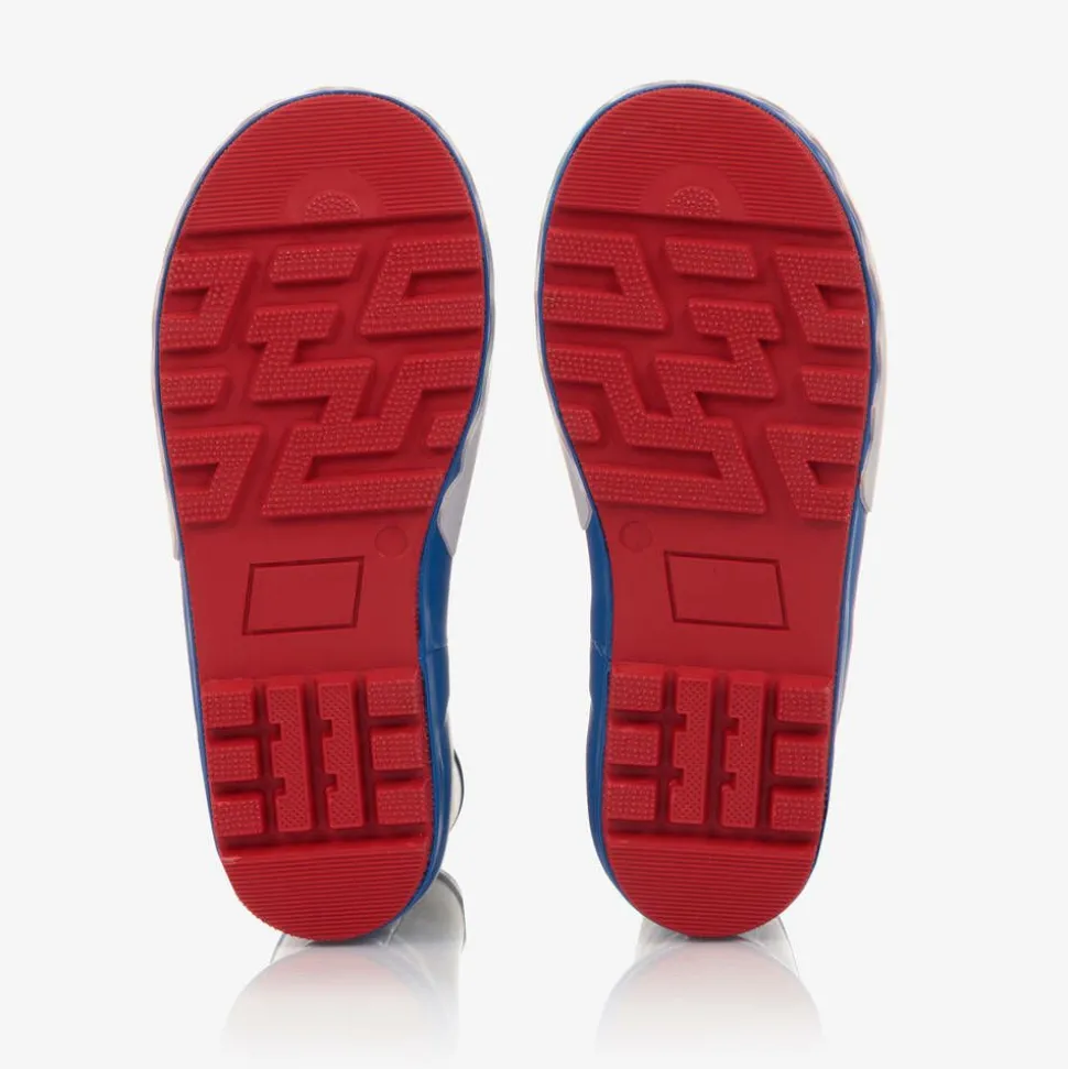 Boys royal blue rain boots by Chipmunks, made of waterproof natural rubber. The lining and inner sole are in soft fleece for insulation, keeping feet warm and toasty. They have fun shark details on the front and chunky red outer soles. Smaller sizes have handles on the sides so they can be pulled on easily.