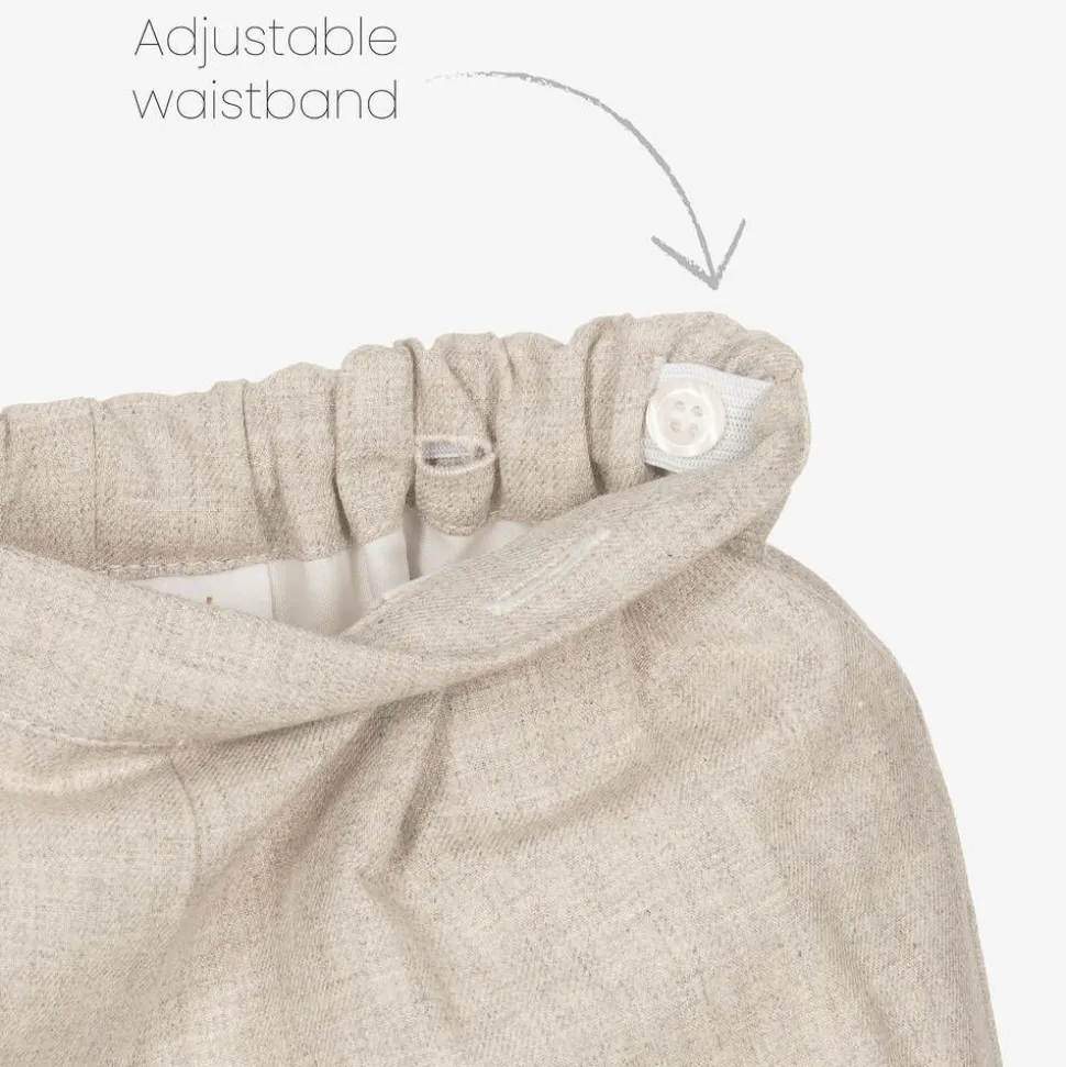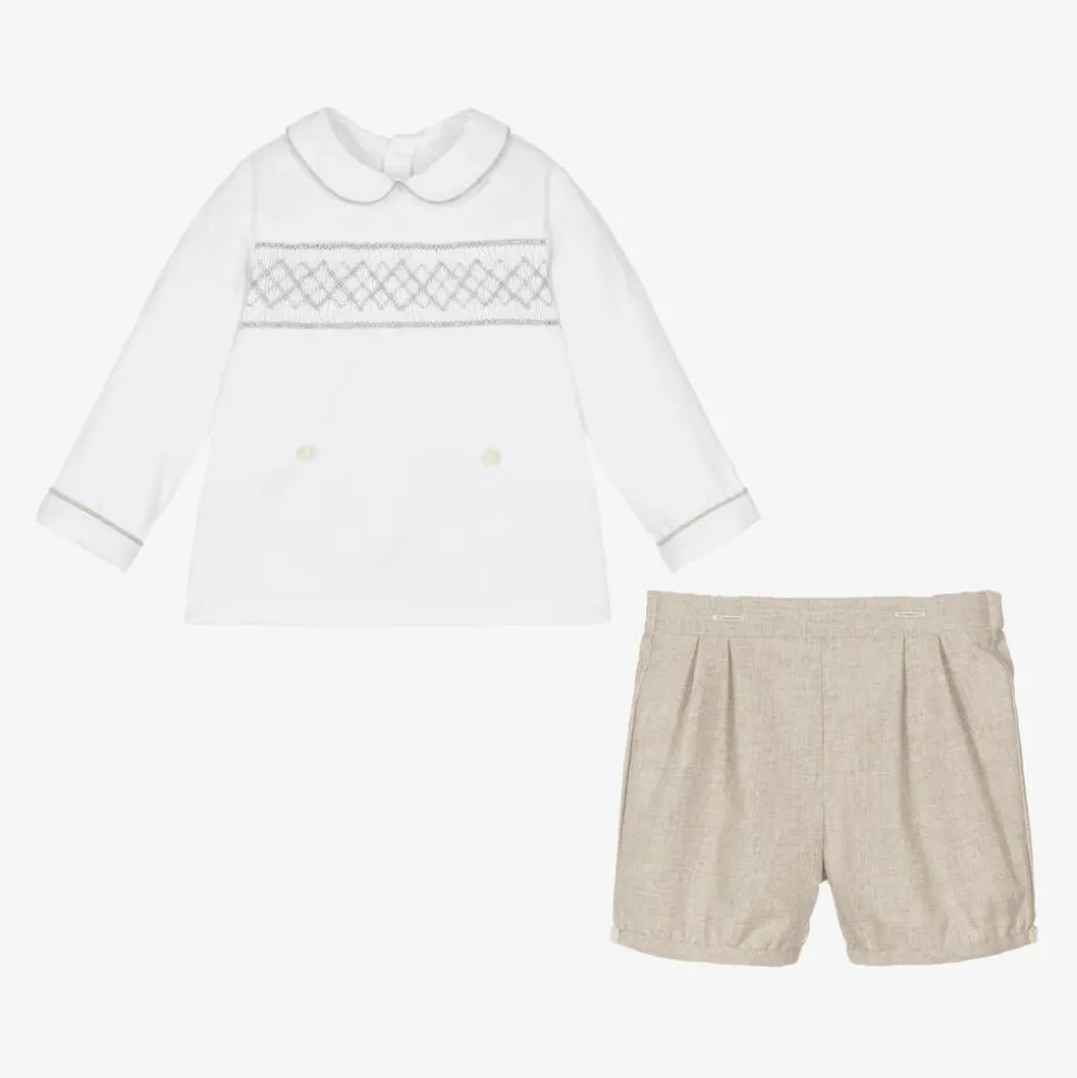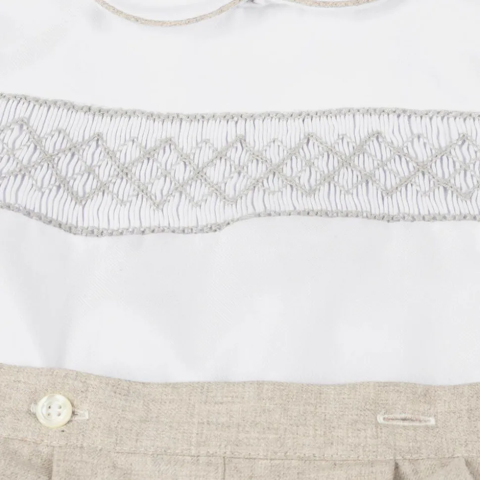 A traditional shorts set for little boys, handmade in soft cotton by Kidiwi. Pleated on the front, the beige shorts are gently elasticated at the back and fully lined for comfort. The white twill shirt has a sweet rounded collar, classic hand smocking across the chest, and coordinating piped trims. The two pieces button together for a neat and tidy finish.
