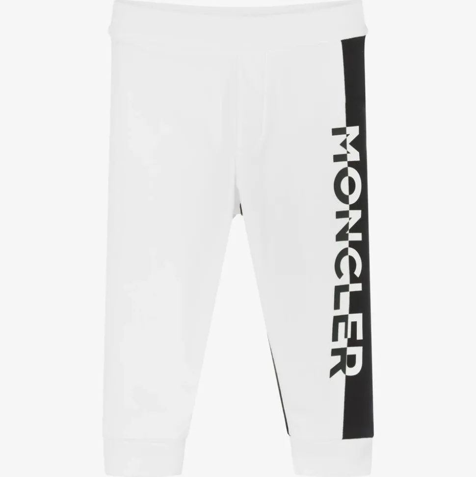 Little boys white and black joggers from luxury designer Moncler Enfant. This monochromatic design is crafted in stretchy, mid-weight cotton jersey with softly ribbed cuffs. They have black and white asymmetric front panels with split rubber logo lettering. The French label's logo tab is stitched on the back below the comfortable elasticated waist.