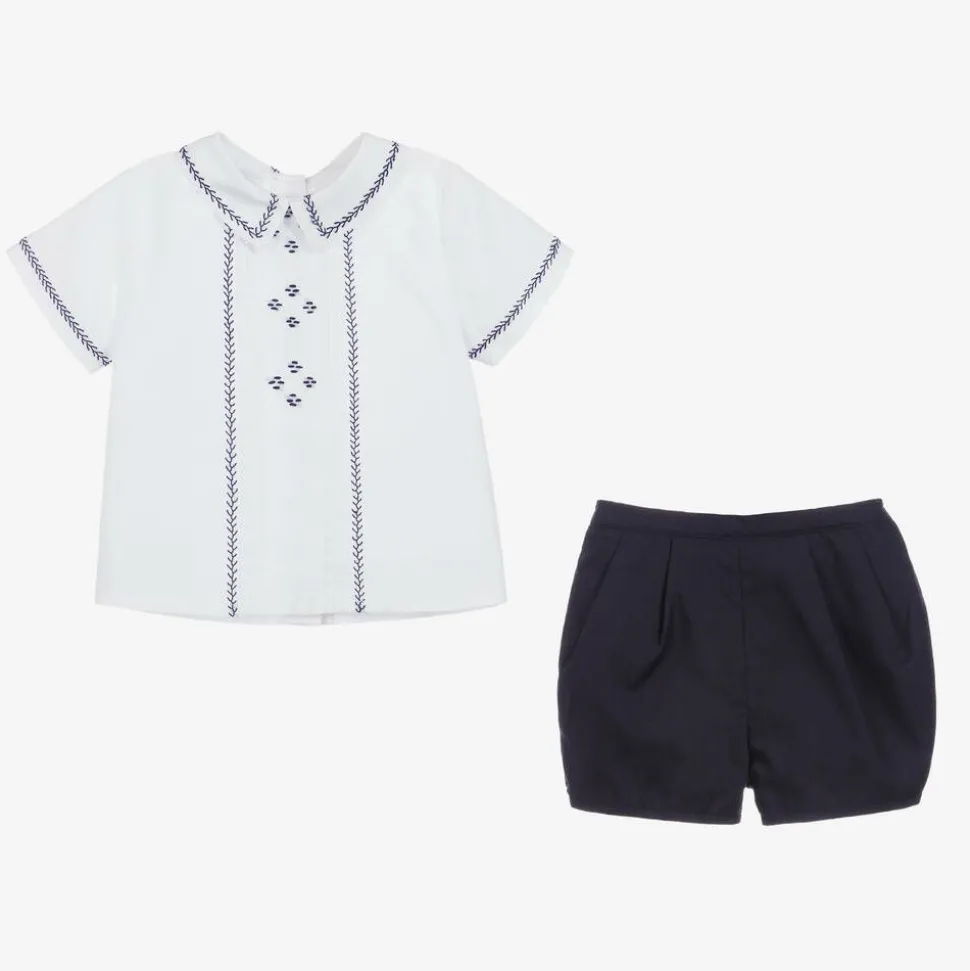 Younger boys white and navy blue shorts set from Sarah Louise, made in soft and lightweight polycotton. The shirt has pretty navy blue embroidery and pintuck pleating. The shorts are fully lined, with an elasticated waist and leg cuffs.