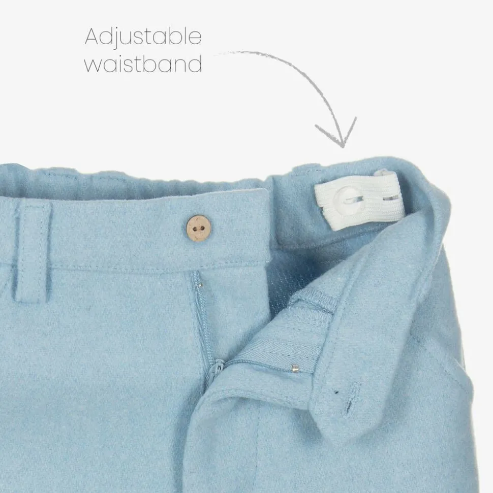 In white and pale blue, this smart-casual trouser set for boys is by Babidu. The trousers are made in a soft wool-feel fabric, with slanted front pockets and faux back pockets. The adjustable waist is comfortably elasticated at the back and has a zip and button closure. The shirt is made in lightweight cotton cheesecloth, with wooden button fastenings and a faux chest pocket detail.
