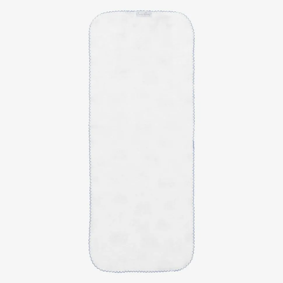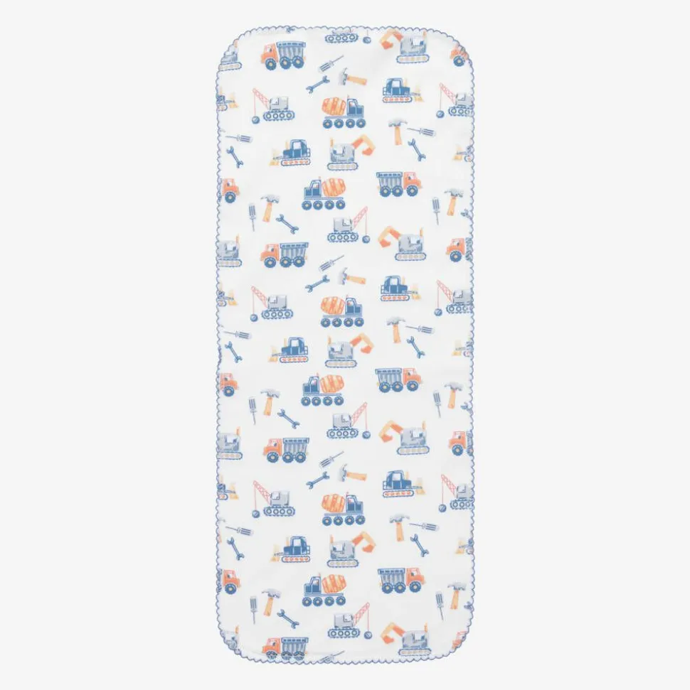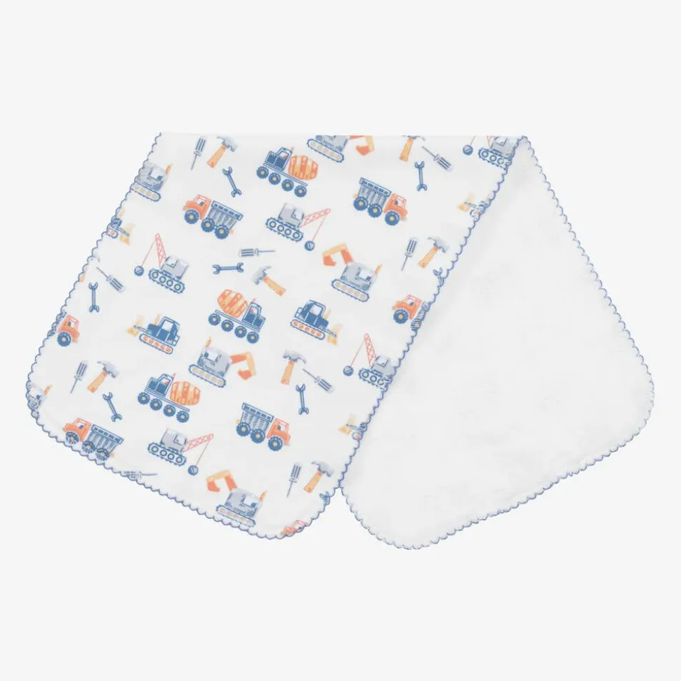 A white burp cloth for baby boys by Kissy Kissy, made from super soft Pima cotton jersey. It is printed with a fun construction-themed pattern, featuring lorries, diggers, and cranes, and is finished with a blue picot trim. Ideal for mopping up spills, it has a soft towelling underside for added absorbency.