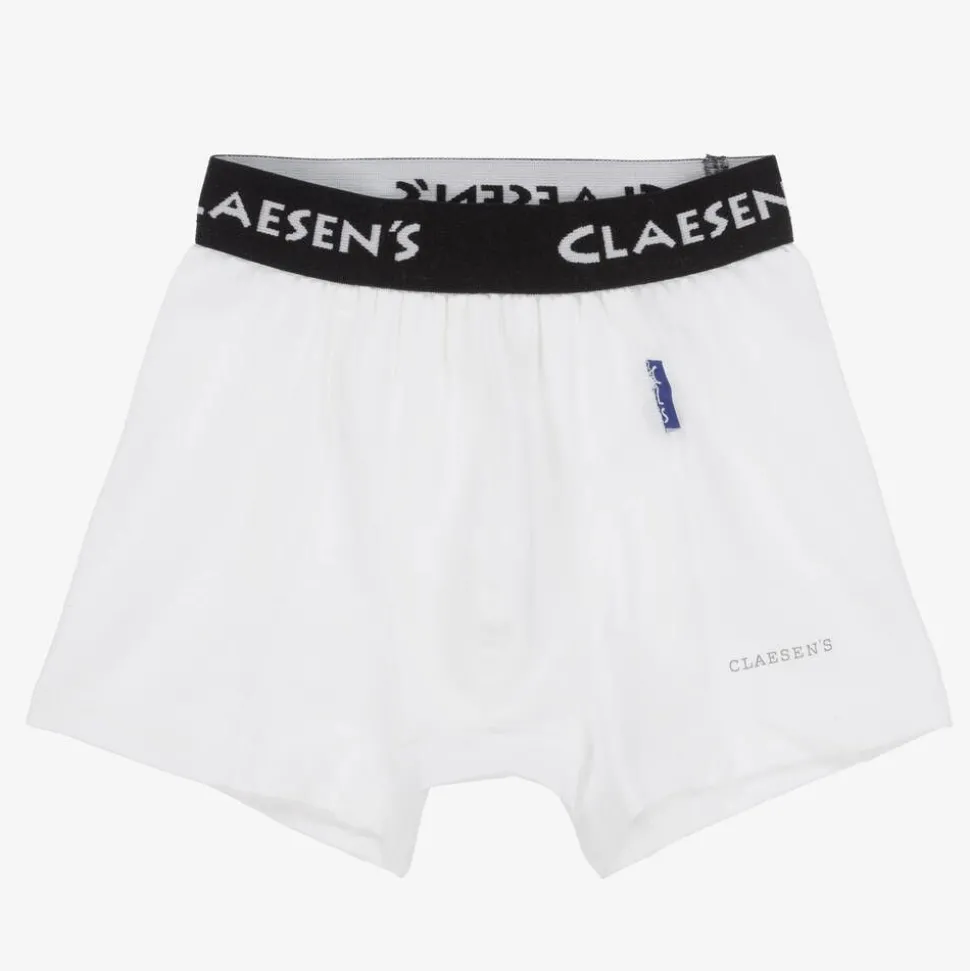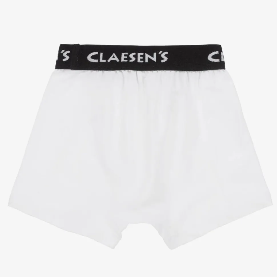 Pack of two white boxer shorts for boys by Claesen's, made in soft cotton jersey. These comfortable boxers have the brand's logo on the waistband for added designer appeal.