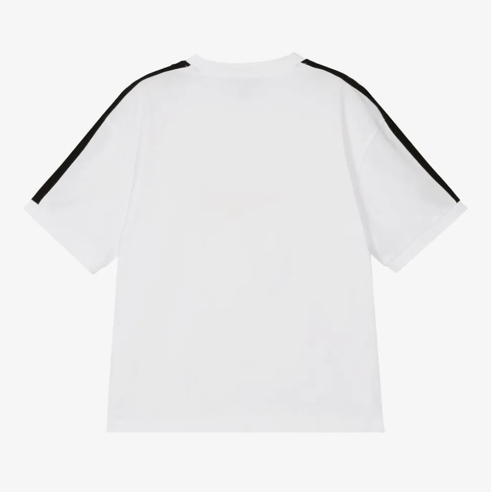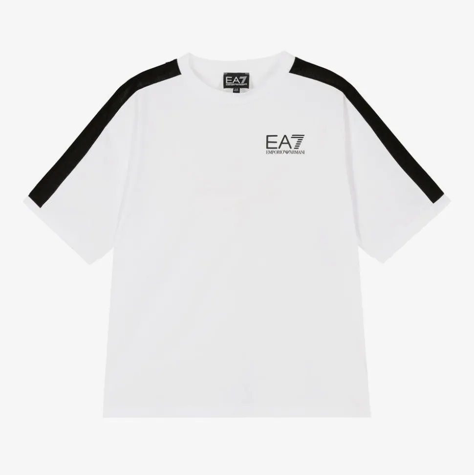 White with black trims, this casual short-sleeved T-shirt for boys is by Italian sporty brand EA7 Emporio Armani. It has the designer's EA7 rubberised logo on the chest for a signature look. In a comfortable regular-plus fit, it is made in soft cotton jersey with ribbed crew neckline.