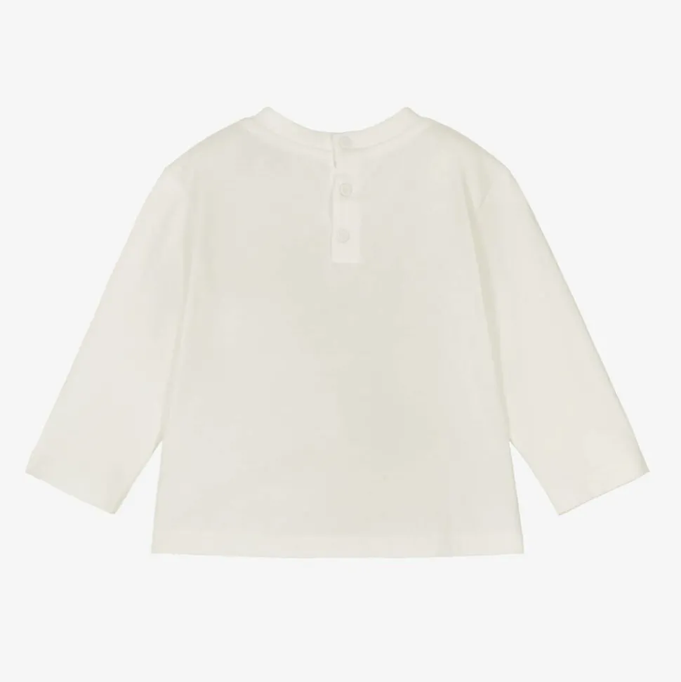 A white long-sleeved top for younger boys by Italian label Emporio Armani, made from soft cotton jersey. Casual and comfortable, this crew neck top features the brand's iconic Eagle logo on the front, printed within a blue scribble-effect circle. To help with dressing, there are branded popper fastenings on the back.