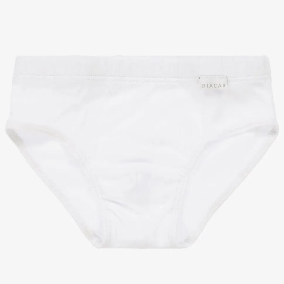 Simple white pants for boys by Diacar. Comfortable to wear, they are made from soft cotton jersey with a subtle pinstripe pattern and have a stretchy elasticated waist.