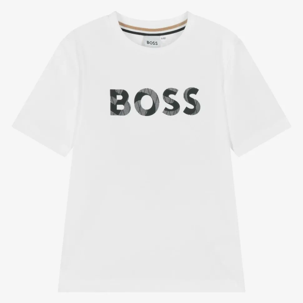 Cool white cotton crew neck T-shirt for boys by BOSS, made in soft jersey. This comfortable everyday wardrobe staple has short sleeves and a rubberised blue BOSS logo on the front.