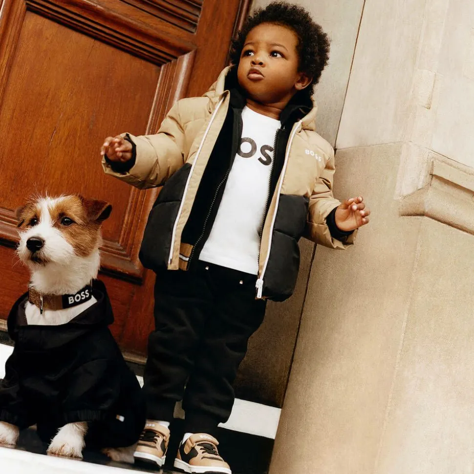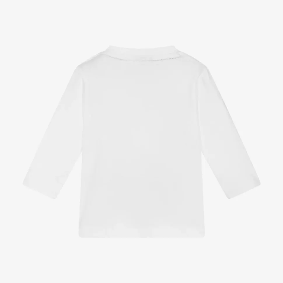 White long-sleeved top for little boys by BOSS, made in soft cotton jersey. Comfortable and easy-wearing, this casual top has a black rubberised logo across the front, for an instant designer statement, and popper fastenings on one shoulder for easy dressing.