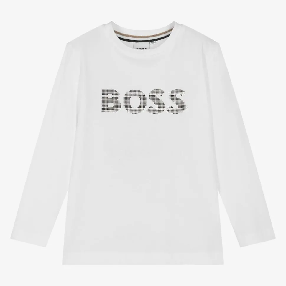 White cotton top for boys by German label BOSS. It has a bold, brown, rubberised logo emblazoned across the front for instant designer impact, and signature tri-colour tape lining the crew neck for added brand appeal. It is made in super soft, comfortable jersey.