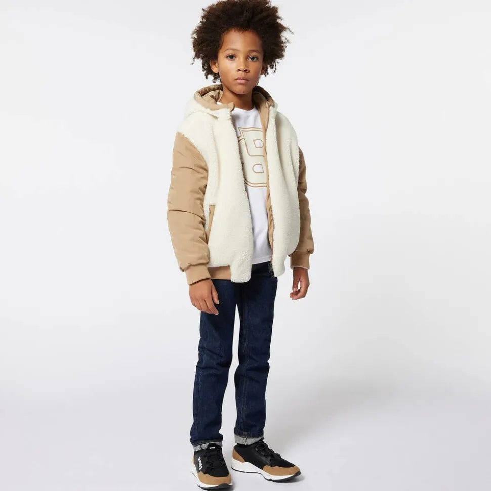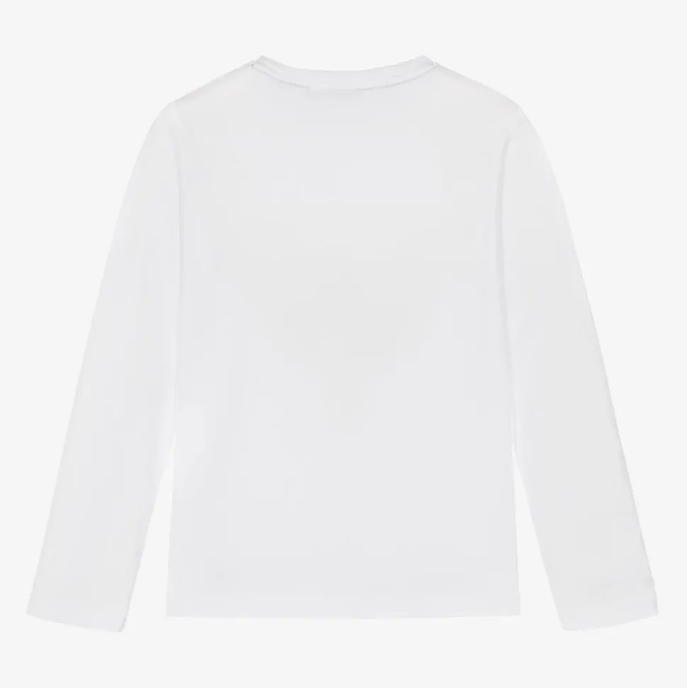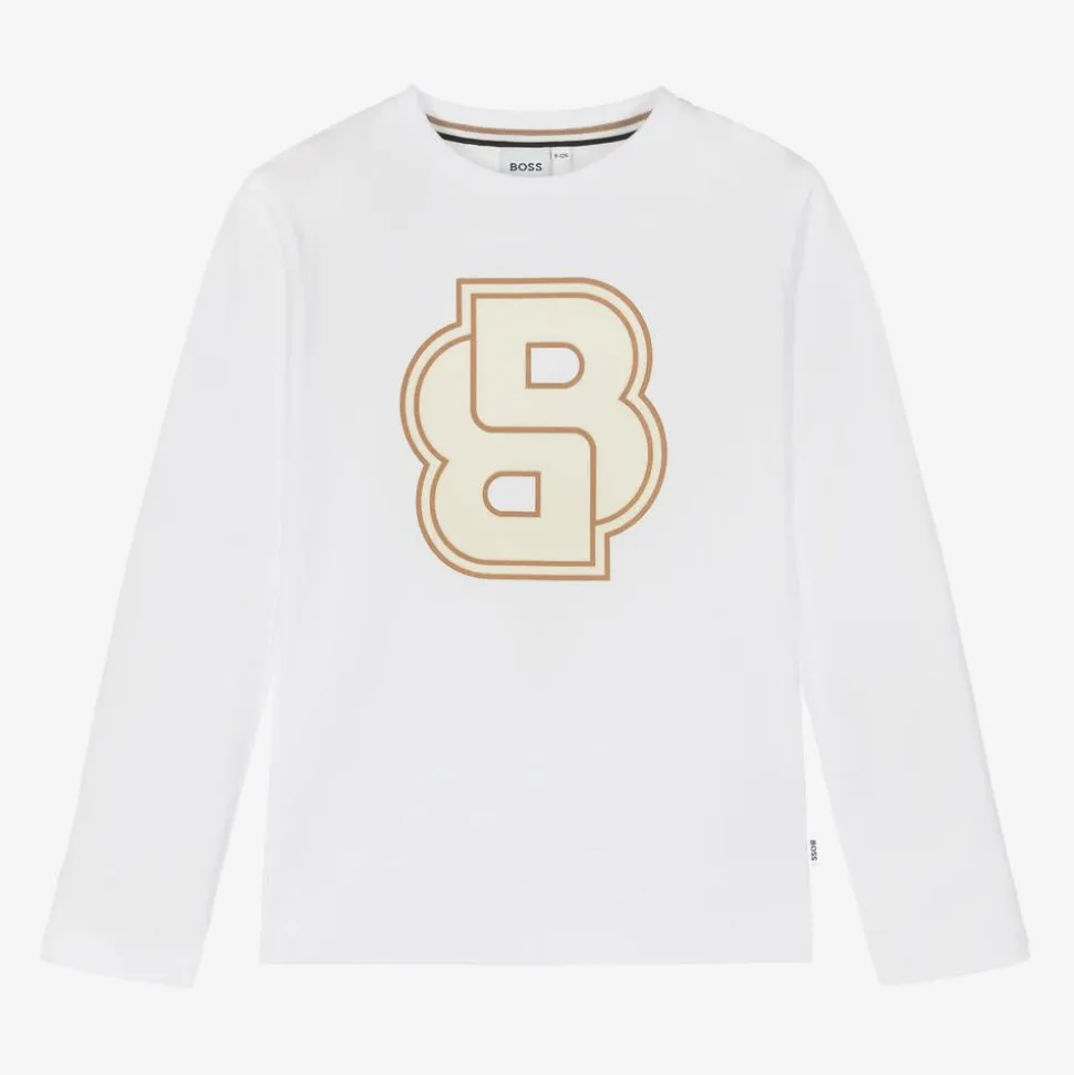 A slim-fitting Mini-me top for boys from BOSS, in bright white with ivory and beige accents. This soft cotton top has a flocked Double B monogram on the front for instant brand recognition. A small logo tab is also stitched to one side seam.