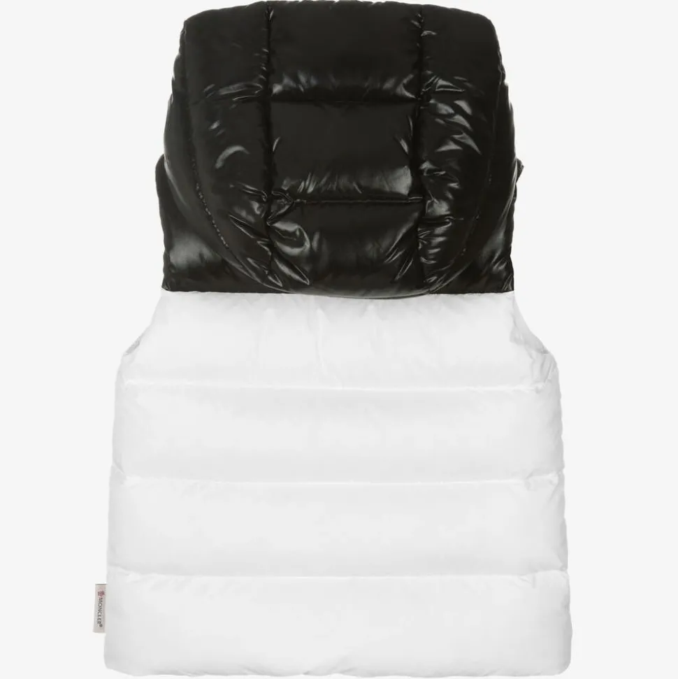 White down-padded gilet jacket for little boys by luxury French brand Moncler Enfant. It is made in water repellent lightweight nylon and is fully lined with soft cotton for added comfort. The detachable hood isin contrasting black for a classic monochrome finish. There is a textile logo on the chest and it fastens with an exposed zip.