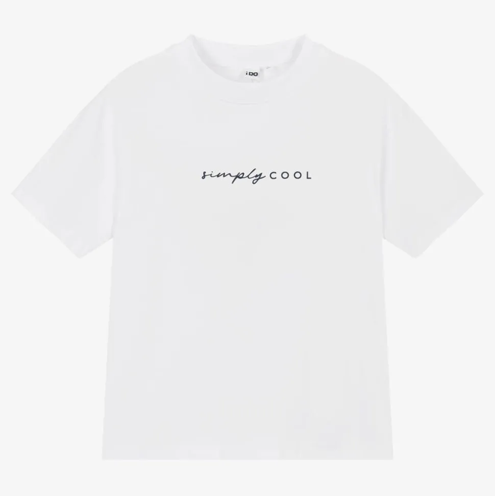 Casual white T-shirt for older boys by iDO Junior, made in soft cotton jersey. It has a 'simply cool' slogan printed across the chest and 'good times' printed on the back of the neck for a cool, graphic look.