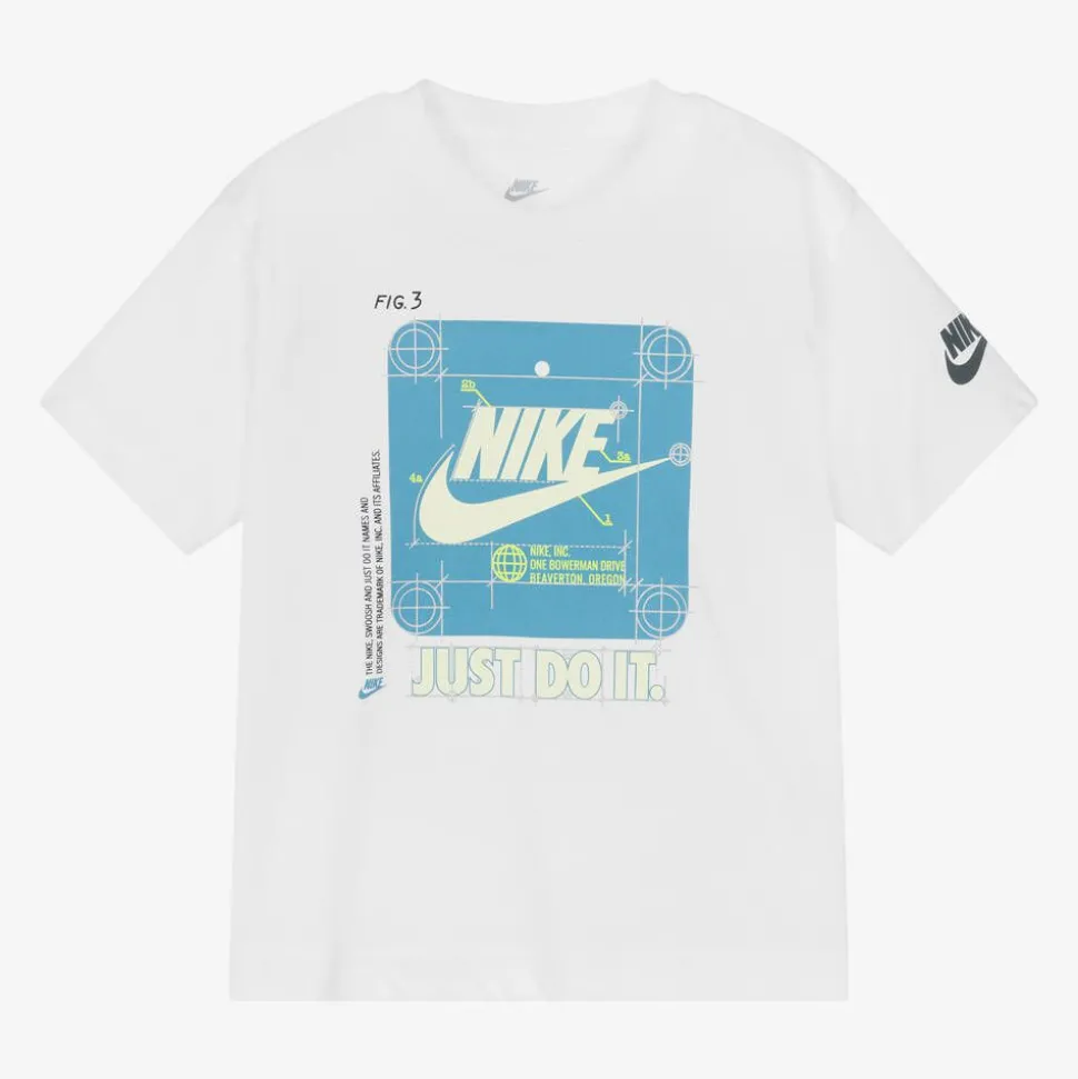 White short-sleeved T-shirt for boys by Nike, made in a soft cotton jersey blend. This casual tee has a ribbed crew neck and a black Swoosh logo print on the sleeve. A blue target graphic is printed on the front, featuring the American brand's Swoosh logo and iconic 'Just Do It' slogan.