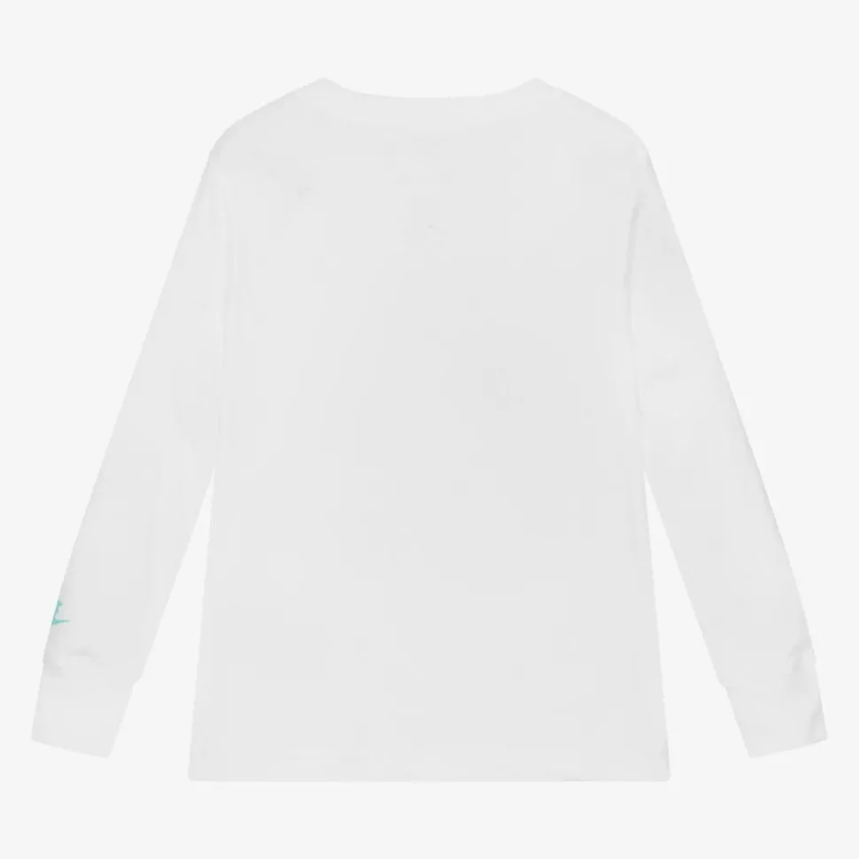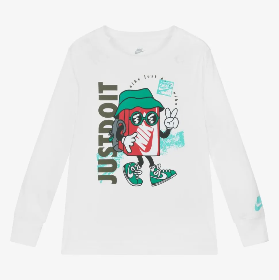 A white long-sleeved top for boys from Nike, made in a soft cotton jersey blend. This casual tee has a round neckline and gently ribbed cuffs. There is a fun graphic print on the front, featuring the well-known Swoosh logo and the brand's iconic 'Just Do It' slogan. Turquoise blue branding on the sleeve completes the look.