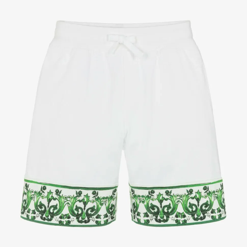 White shorts for boys by luxury label Dolce & Gabbana, made from soft cotton piqué. Great for a stand-out casual look, they have vibrant green Majolica-printed trims on the cuffs and the back patch pocket for a distinct finish. The wide ribbed jersey elasticated waistband has an adjustable drawstring for a comfortable fit, and there are discreet pockets hidden in the side seams for added practicality.