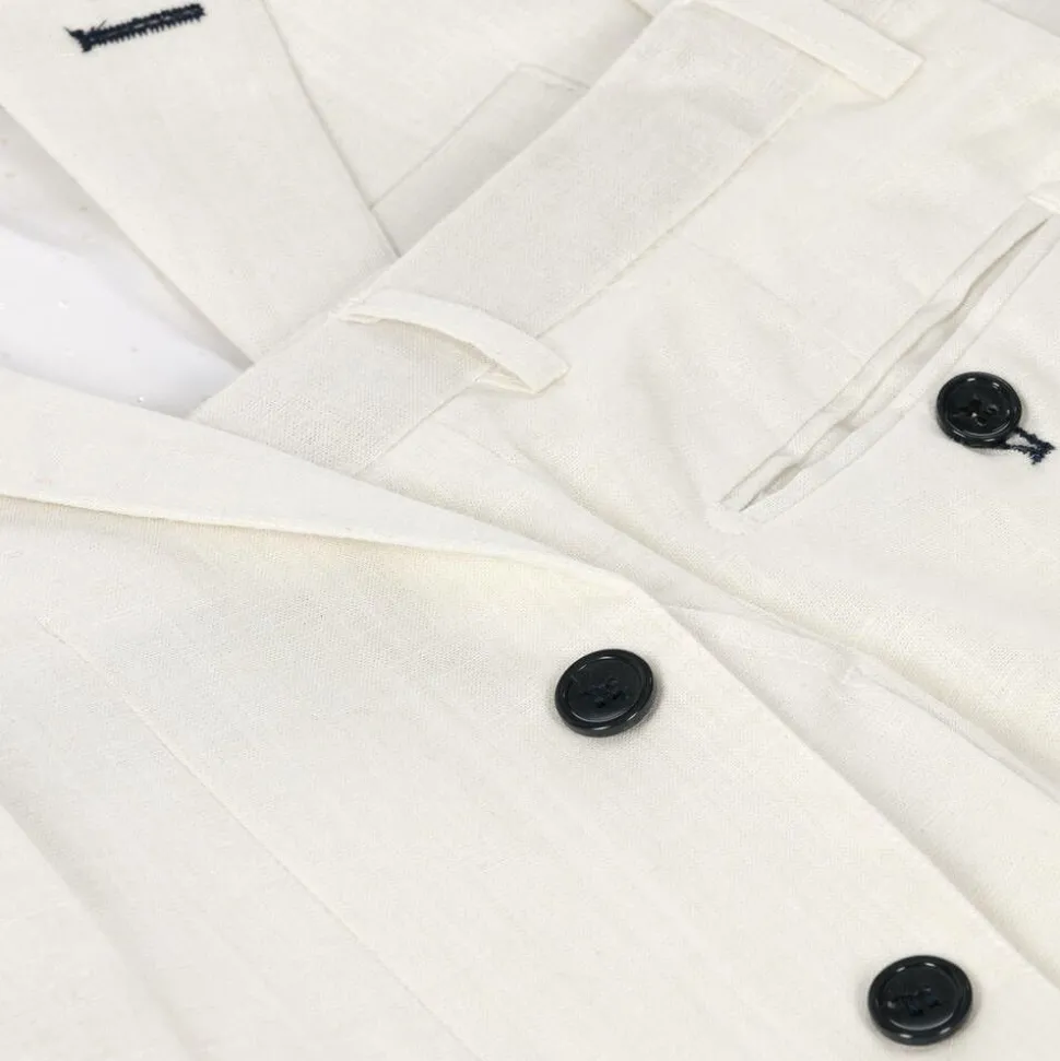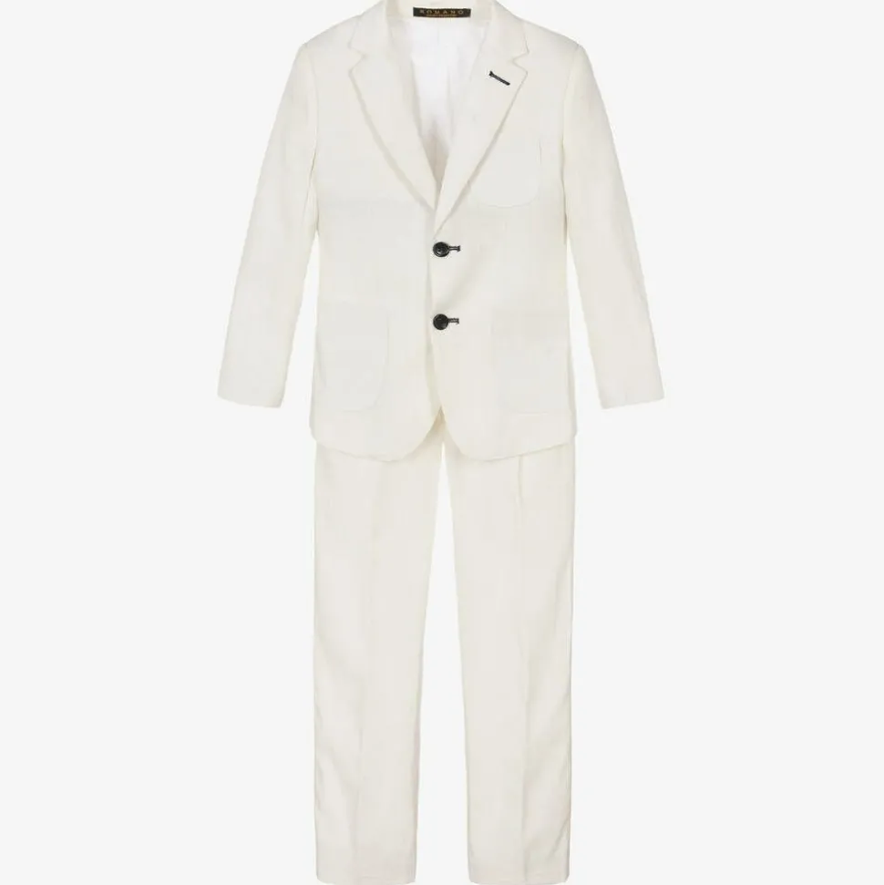 An elegant off-white trouser suit for boys by Romano, made in comfortable linen and cotton blend. The single-breasted jacket is lined in silky satin for a luxurious feel, with vents on the back for ease of movement. There are front patch pockets, grey elbow patches on the sleeves, and button trims on the cuffs. The trousers have front and back pockets, a zip, hook and eye fastening, and an adjustable waist for an ideal fit.