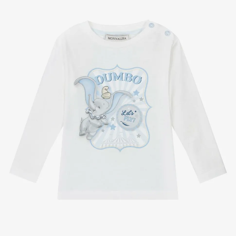White long-sleeved top for little boys by Monnalisa, made in soft organic cotton jersey. Lightweight and comfortable, this casual top has Disney's adorable Dumbo character printed on the front in blue. It fastens with branded buttons on one shoulder.