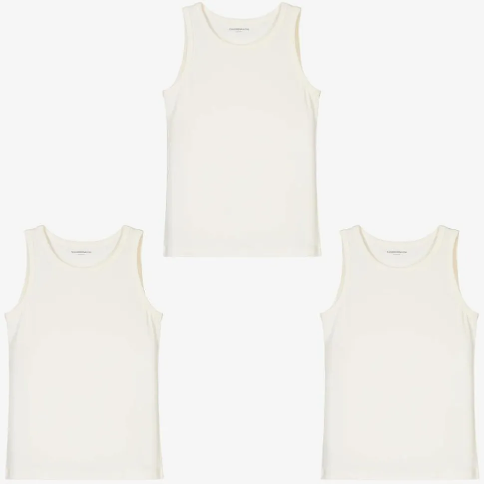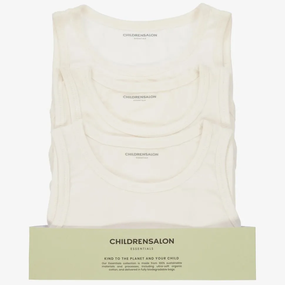 A pack of three vests for boys by Childrensalon Essentials, made with ultra-soft, stretchy organic cotton jersey. Ideal as wardrobe staples, they are off-white. The set is presented in fully biodegradable packaging.